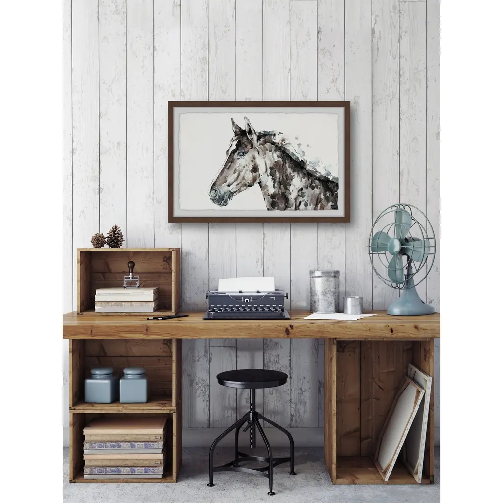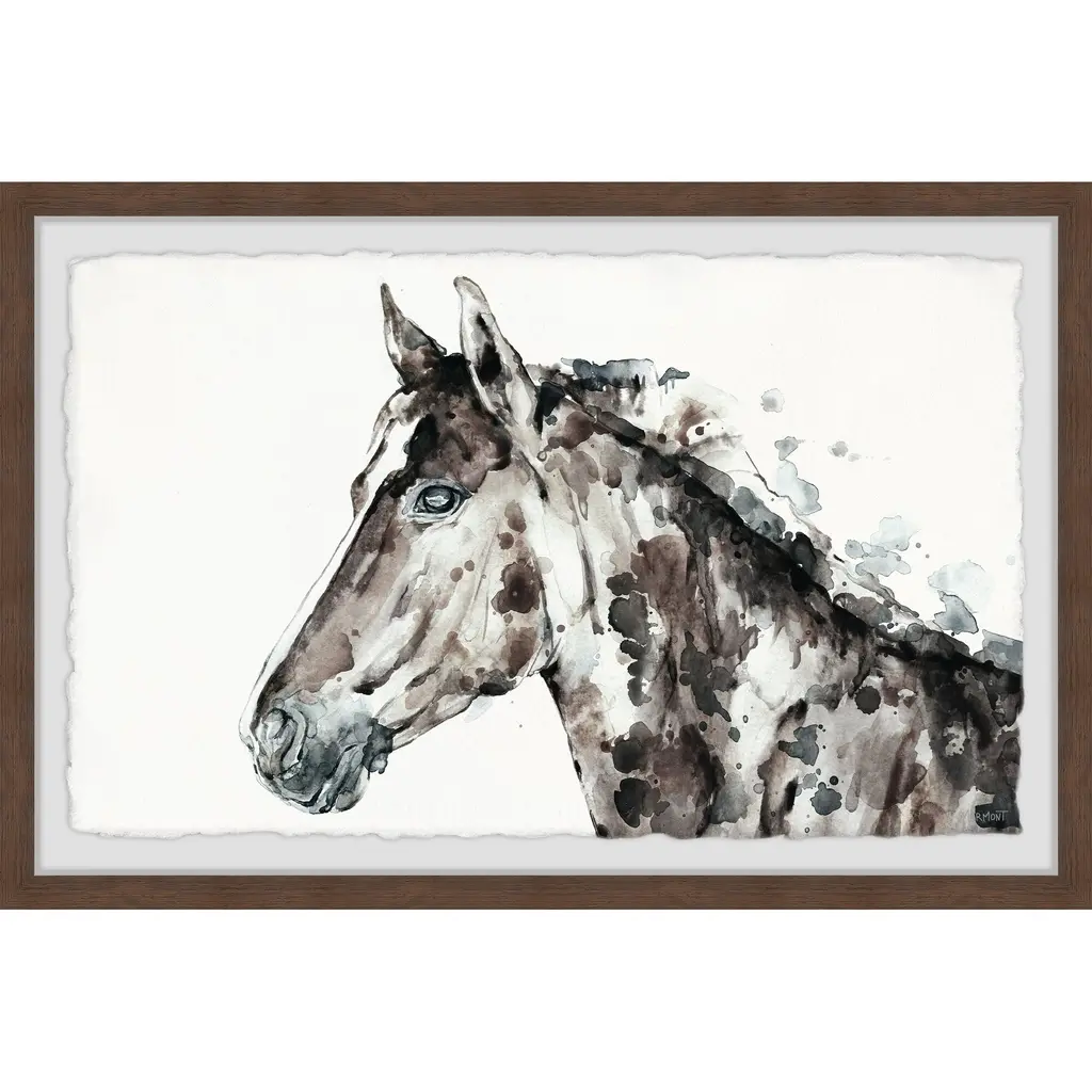 Within this frame floats a watercolor print of a horse. Side profile, the white stripe down the face is just barely visible with a speckled brown coat. The style makes it seem the horse is moving. This piece is printed on high quality archive paper and professionally hand-framed. With wall-mounting hooks included, this artful accent is ready to hang up as soon as it reaches your front door. • Top quality Giclee print on high resolution Archive Paper • Hand cut deckled edges • High quality durable non-warping frame • Finished under shatter resistant plexiglass • Arrives ready to hang • Includes a certificate of authenticity • Printed in the USA