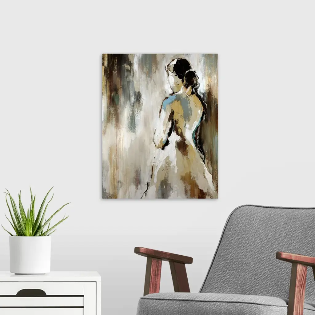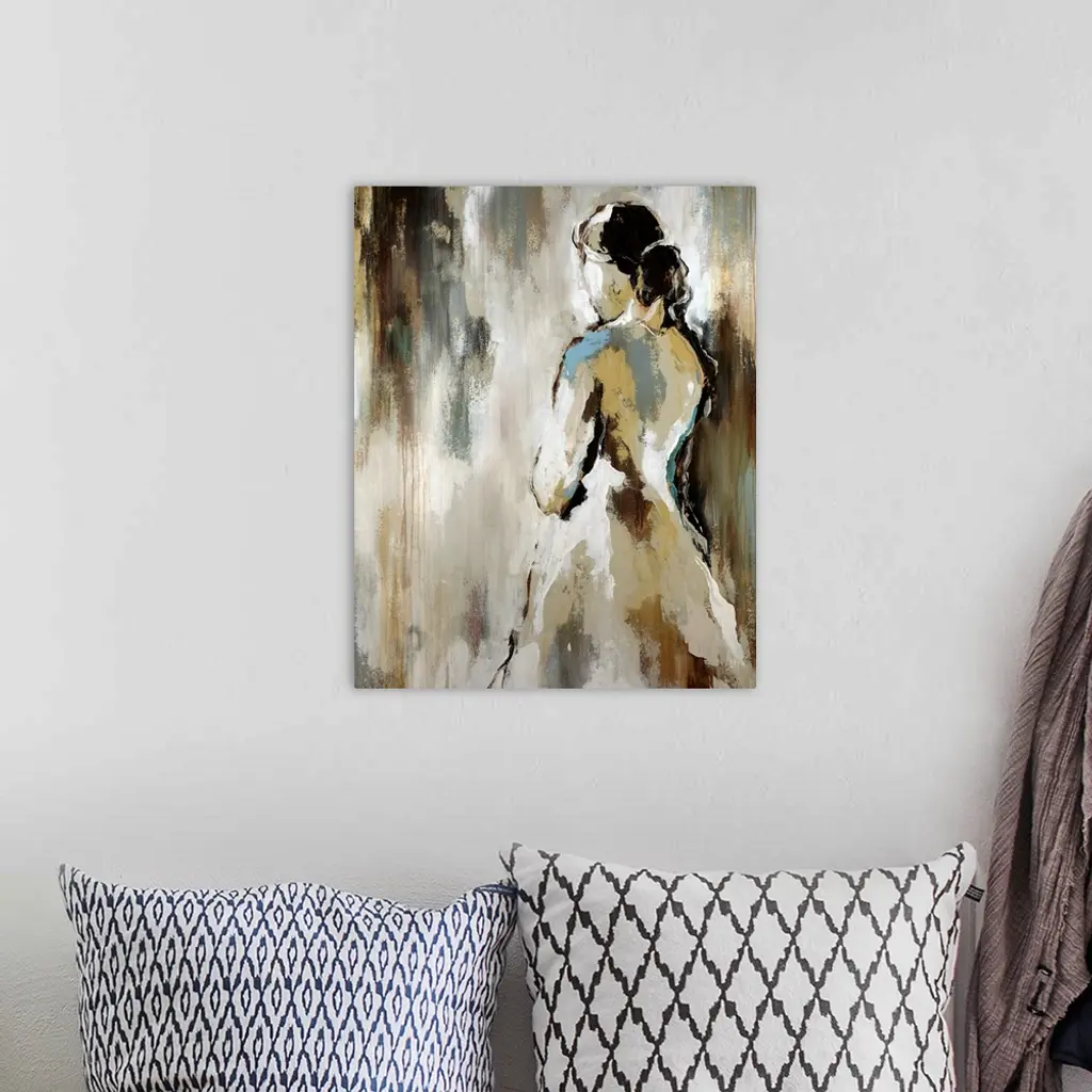 Giant abstract painting of a woman leaning against a wall in a dress looking the other way with a grungy textured background.