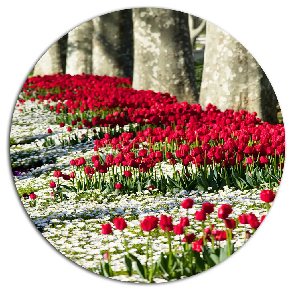 Bring Contemporary Abstraction to your home with this large Circle Metal wall art. This Tulip Garden with Yellow Flowers Metal Artwork makes it the focal point of any room or office. - White Gloss Coating ensures colors are extra vibrant with light reflection.- Aluminum grade Sheet Metal with 1 inch mounting frame on the back giving the illusion that the artwork is floating on the wall..- Mounting Brackets are included along with instructions.- High Quality Digital images are created directly into a glossy aluminum panel producing a stunning and captivating print into the glossy finish of the metal.- Water, Fire and Scratch resistant HD Aluminum panels.- Looks better than any photo paper and guaranteed to last at least 20 years- Easy to clean with a microfiber cloth. Colors are far superior to regular Canvas Art. - Easy to Hang