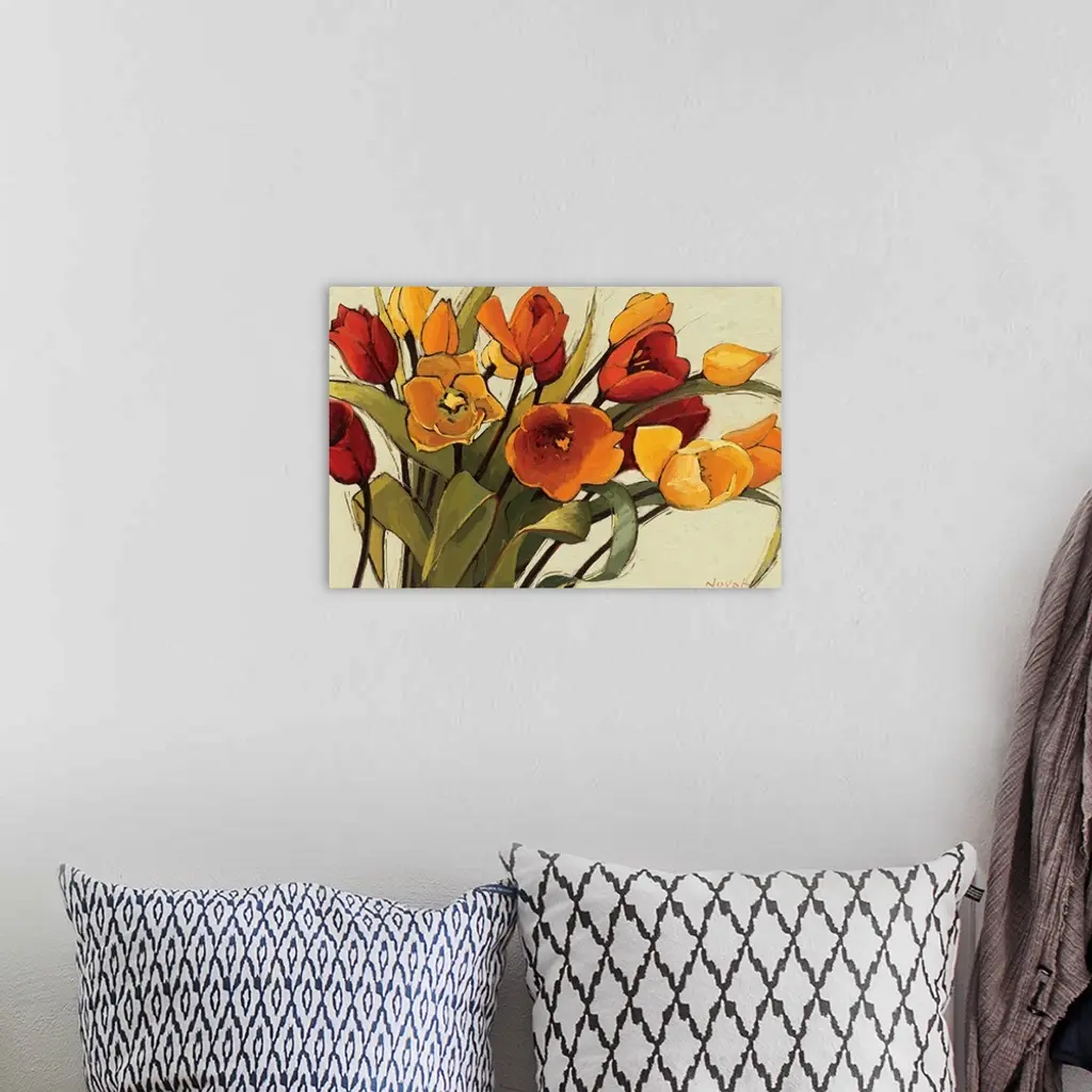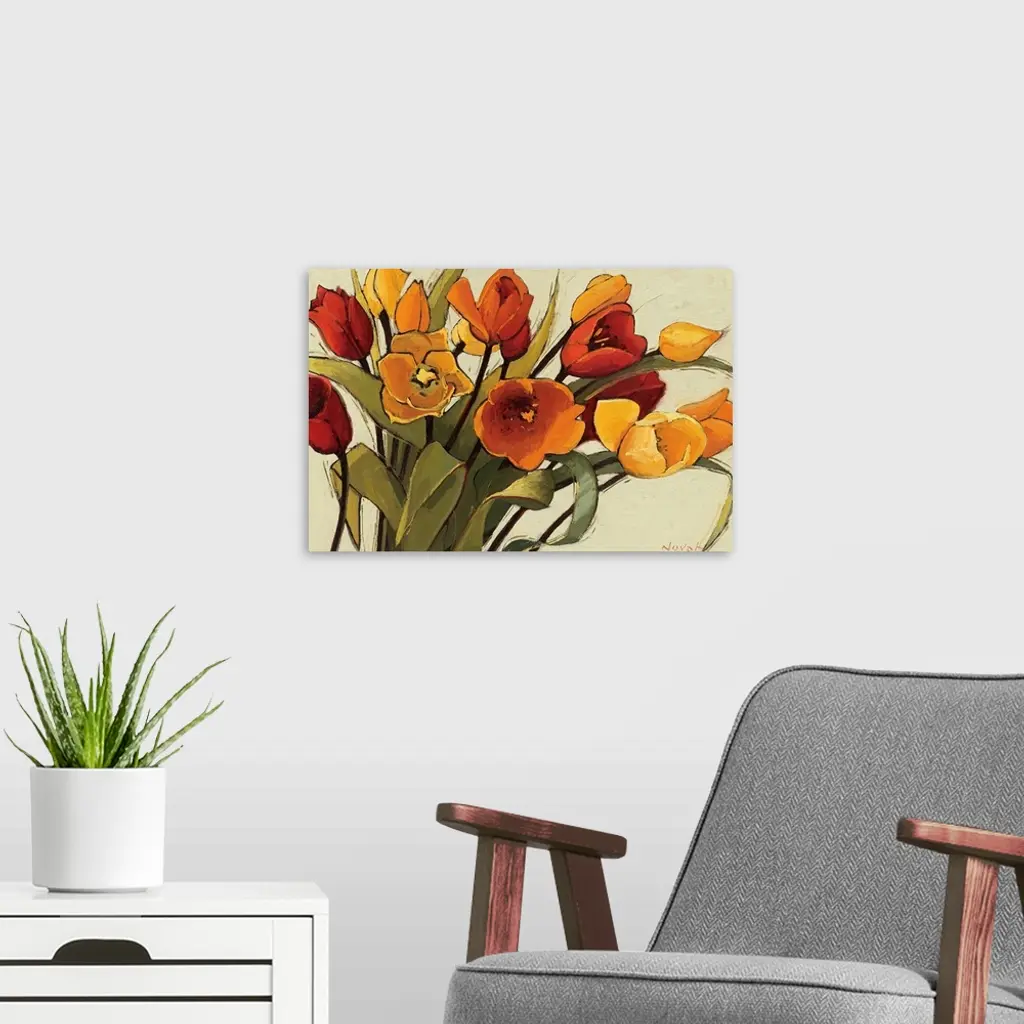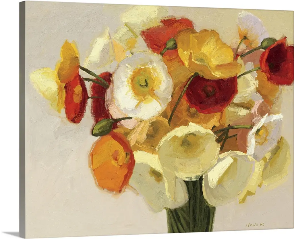 A horizontal painting that is a close up of a floral arrangement with warm, sunshiny colors.