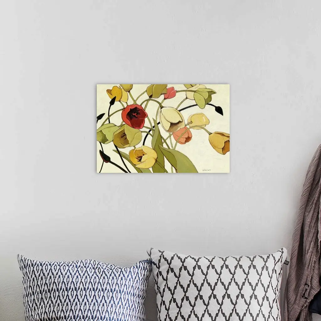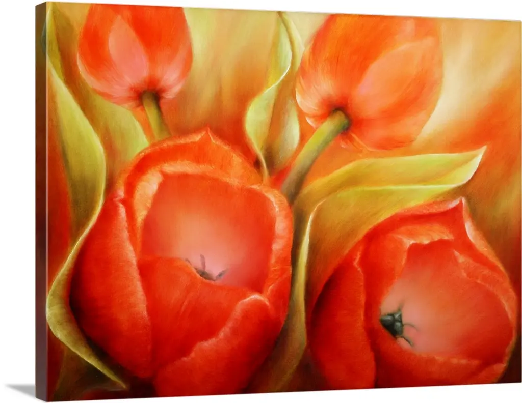 Contemporary painting of flower blooming surrounded by their leaves and other flower buds.