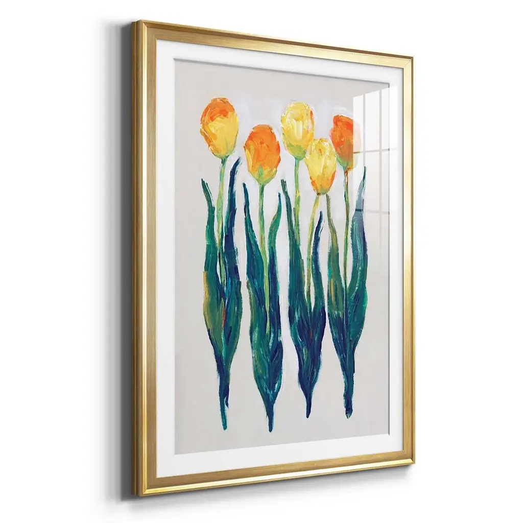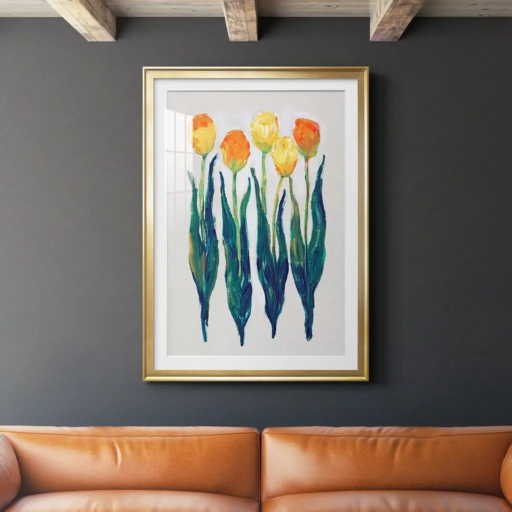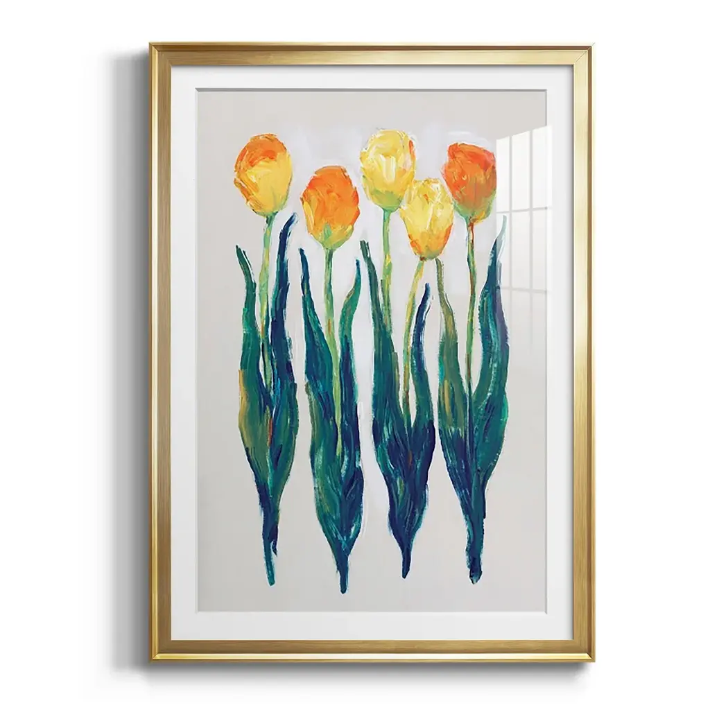Tulips in a Row I Premium Framed Print - Ready to Hang A Premium Framed Print created to last. Framed in distressed wood and available in an array of sizes and colors Featuring a beveled a solid wood stretcher bar, each piece comes ready to hand 4 SIZES AVAILABLE 30.5''X42.5'' - Overall Size 26.5'X36.5'' - Overall Size 22.5''x30.5'' - Overall Size 18.5''x24.5'' - Overall Size Each piece is made to order. Each piece comes with hanging hardware. Made in the USA Ready to Hang Giclee Paper Print Acrylic Glass Beveled Matt Board