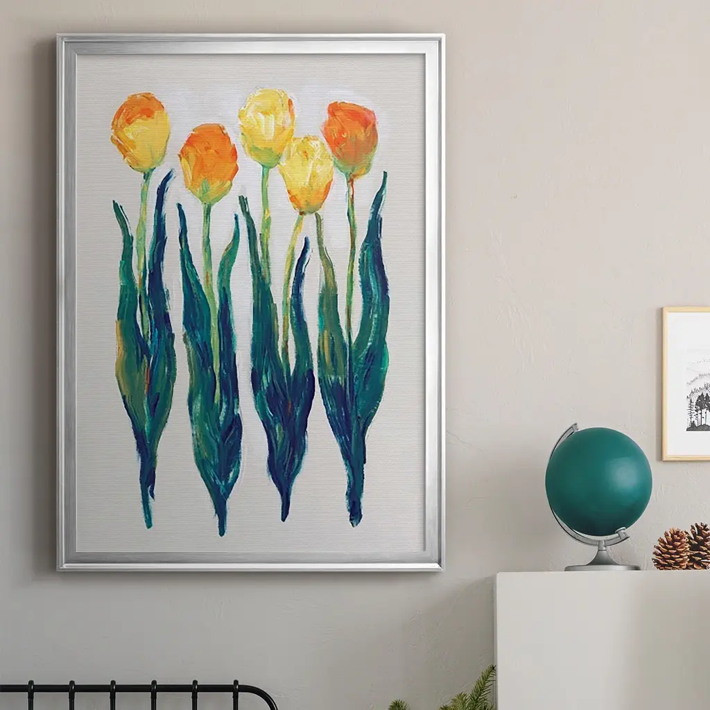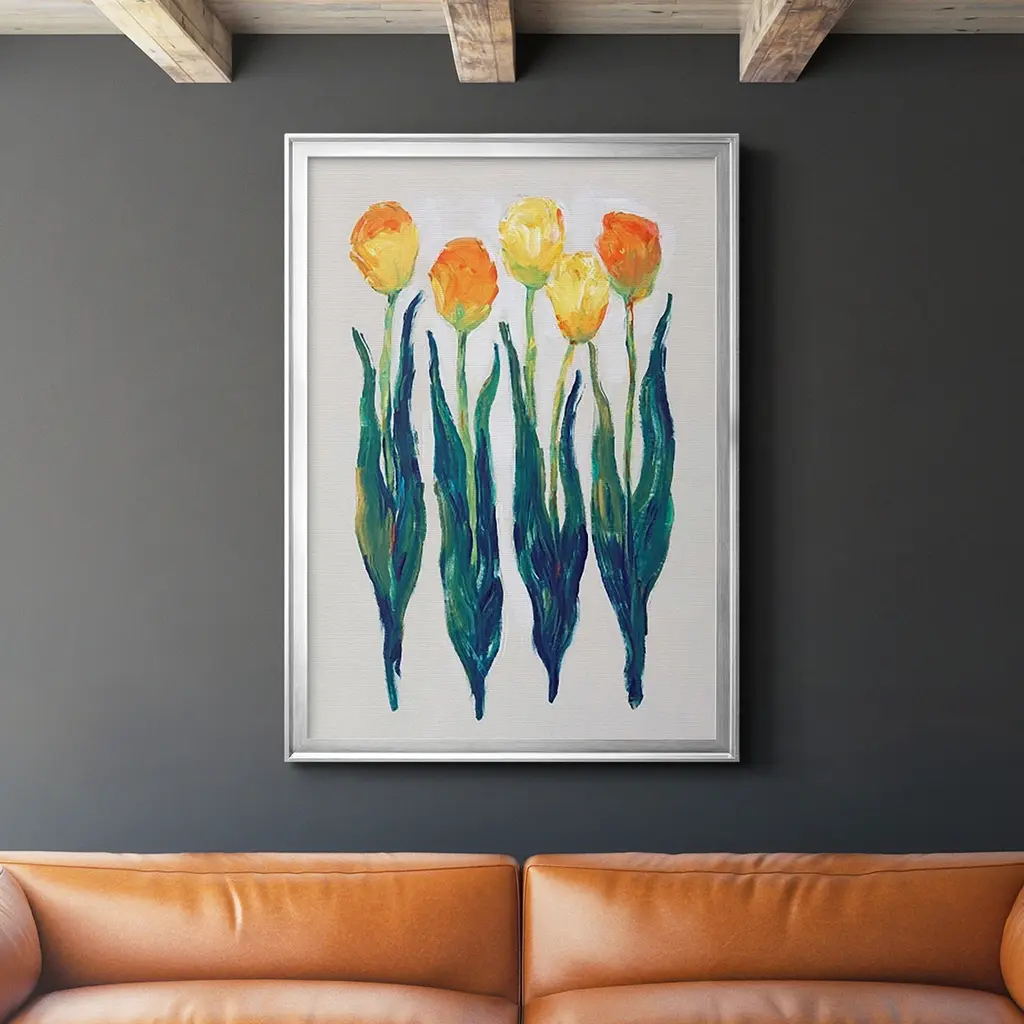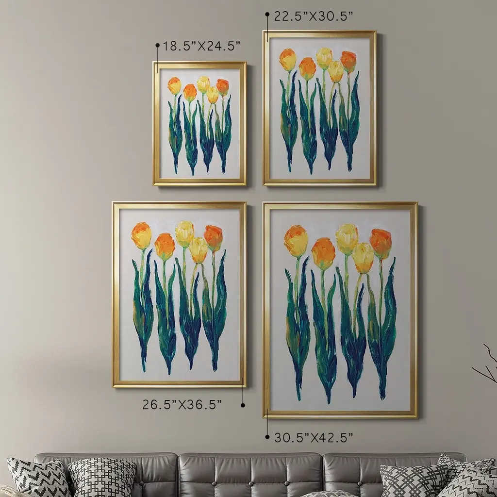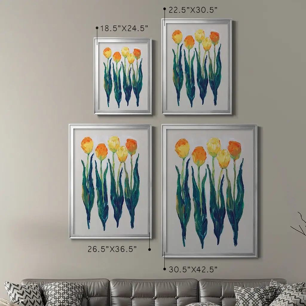 Tulips in a Row I Premium Framed Print - Ready to Hang A Premium Framed Print created to last. Framed in distressed wood and available in an array of sizes and colors Featuring a beveled a solid wood stretcher bar, each piece comes ready to hand 4 SIZES AVAILABLE 30.5''X42.5'' - Overall Size 26.5'X36.5'' - Overall Size 22.5''x30.5'' - Overall Size 18.5''x24.5'' - Overall Size Each piece is made to order. Each piece comes with hanging hardware. Made in the USA Ready to Hang