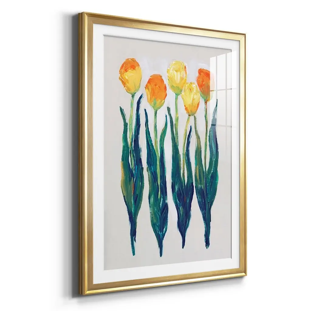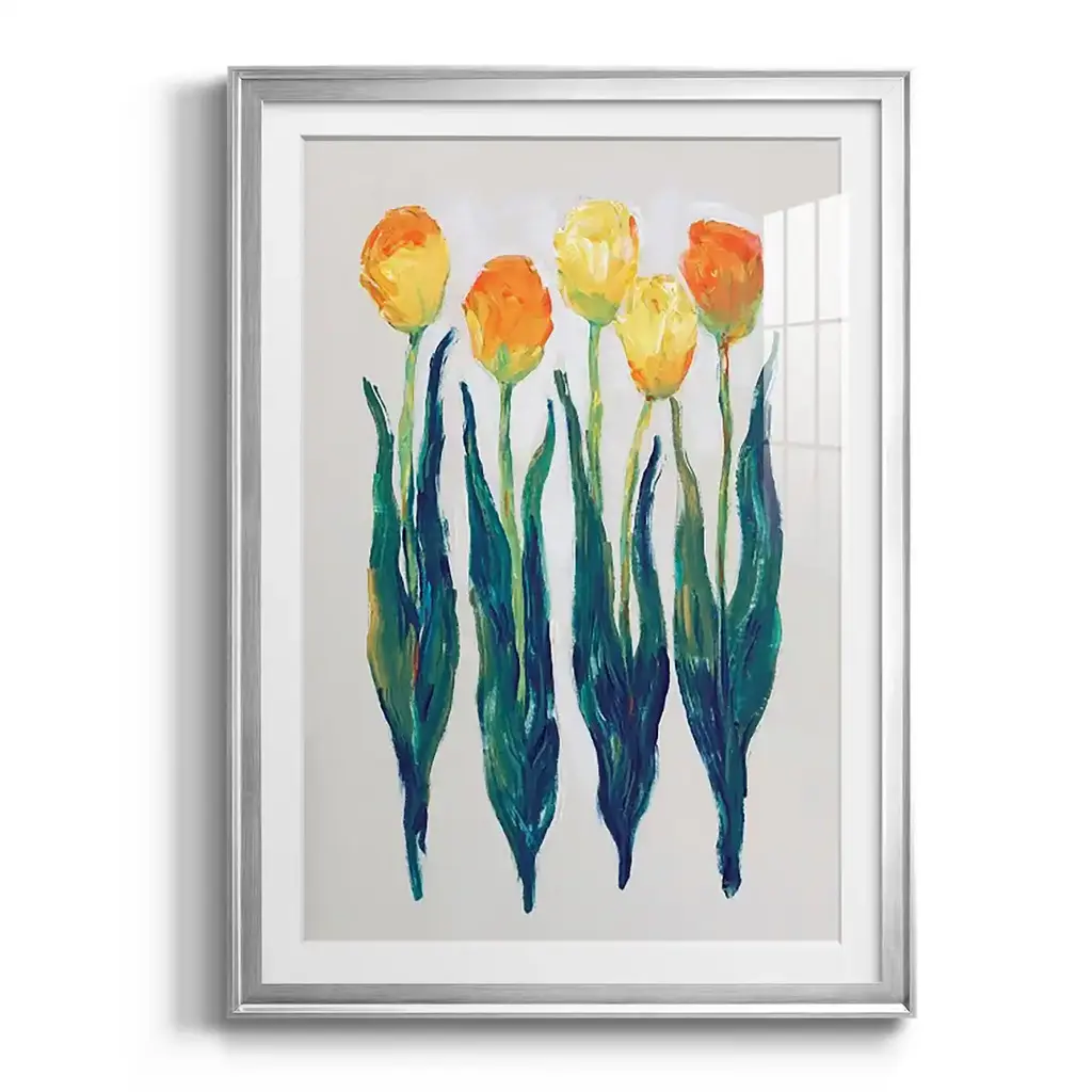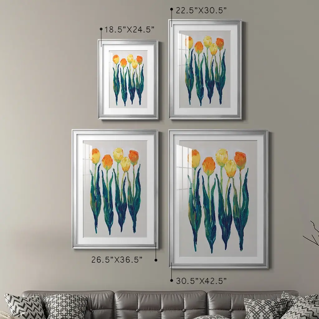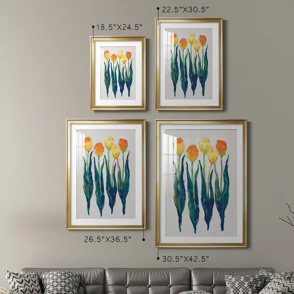 Tulips in a Row I Premium Framed Print - Ready to Hang A Premium Framed Print created to last. Framed in distressed wood and available in an array of sizes and colors Featuring a beveled a solid wood stretcher bar, each piece comes ready to hand 4 SIZES AVAILABLE 30.5''X42.5'' - Overall Size 26.5'X36.5'' - Overall Size 22.5''x30.5'' - Overall Size 18.5''x24.5'' - Overall Size Each piece is made to order. Each piece comes with hanging hardware. Made in the USA Ready to Hang Giclee Paper Print Acrylic Glass Beveled Matt Board