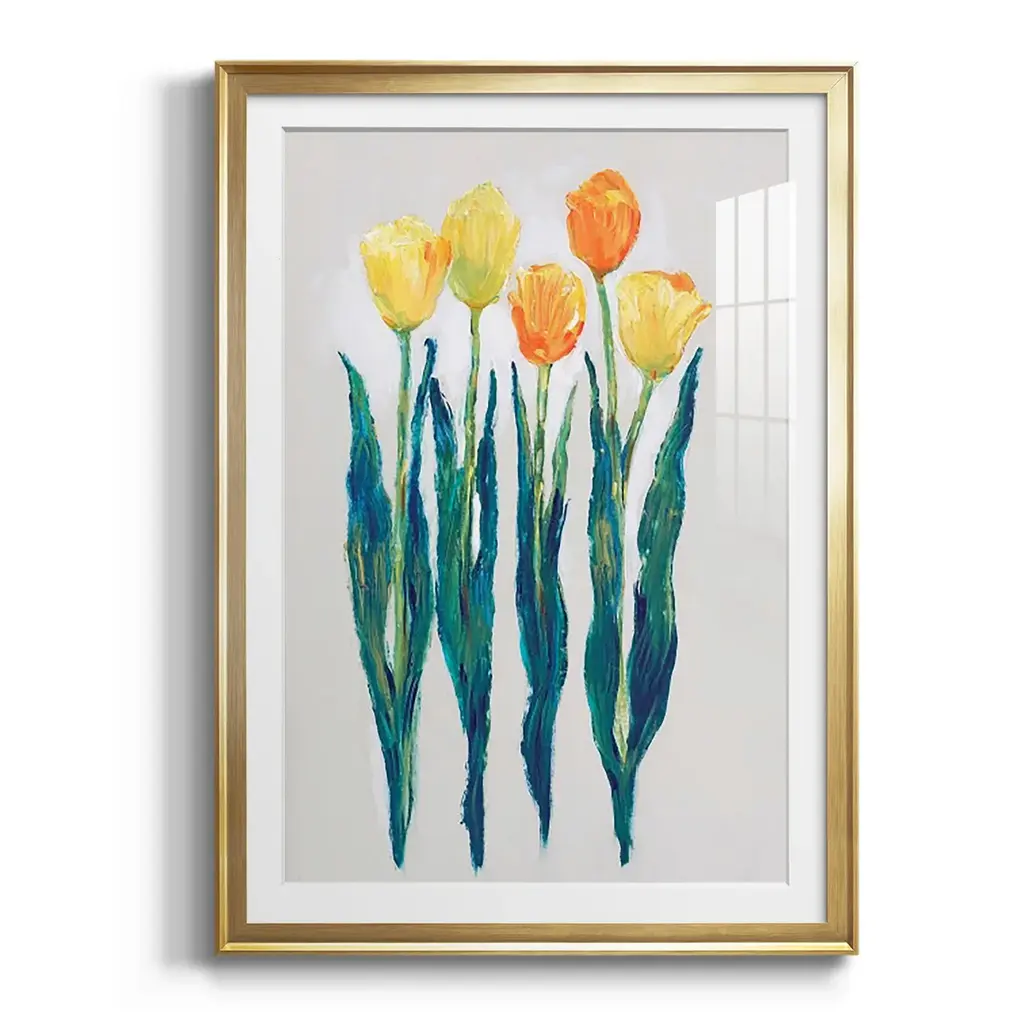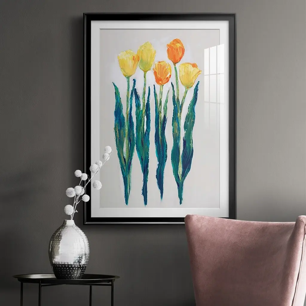 Tulips in a Row II Premium Framed Print - Ready to Hang A Premium Framed Print created to last. Framed in distressed wood and available in an array of sizes and colors Featuring a beveled a solid wood stretcher bar, each piece comes ready to hand 4 SIZES AVAILABLE 30.5''X42.5'' - Overall Size 26.5'X36.5'' - Overall Size 22.5''x30.5'' - Overall Size 18.5''x24.5'' - Overall Size Each piece is made to order. Each piece comes with hanging hardware. Made in the USA Ready to Hang Giclee Paper Print Acrylic Glass Beveled Matt Board