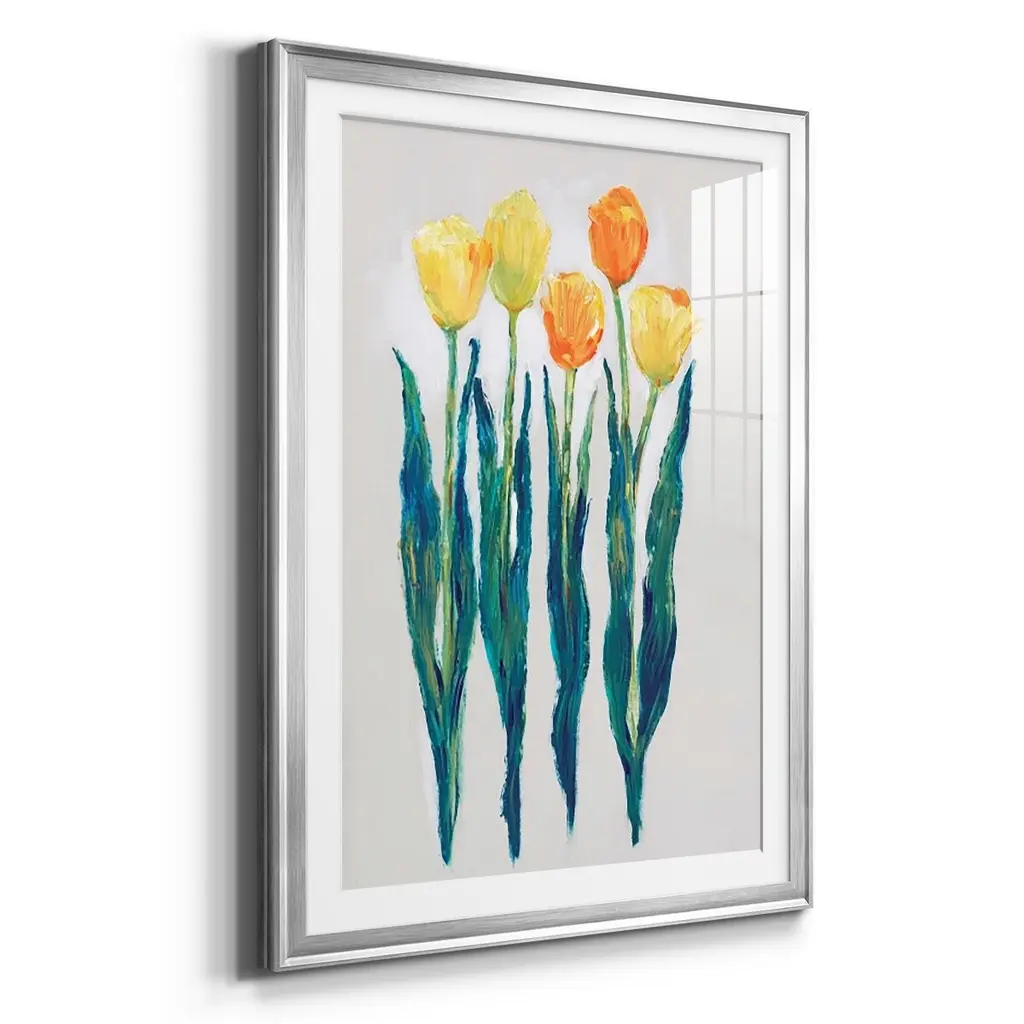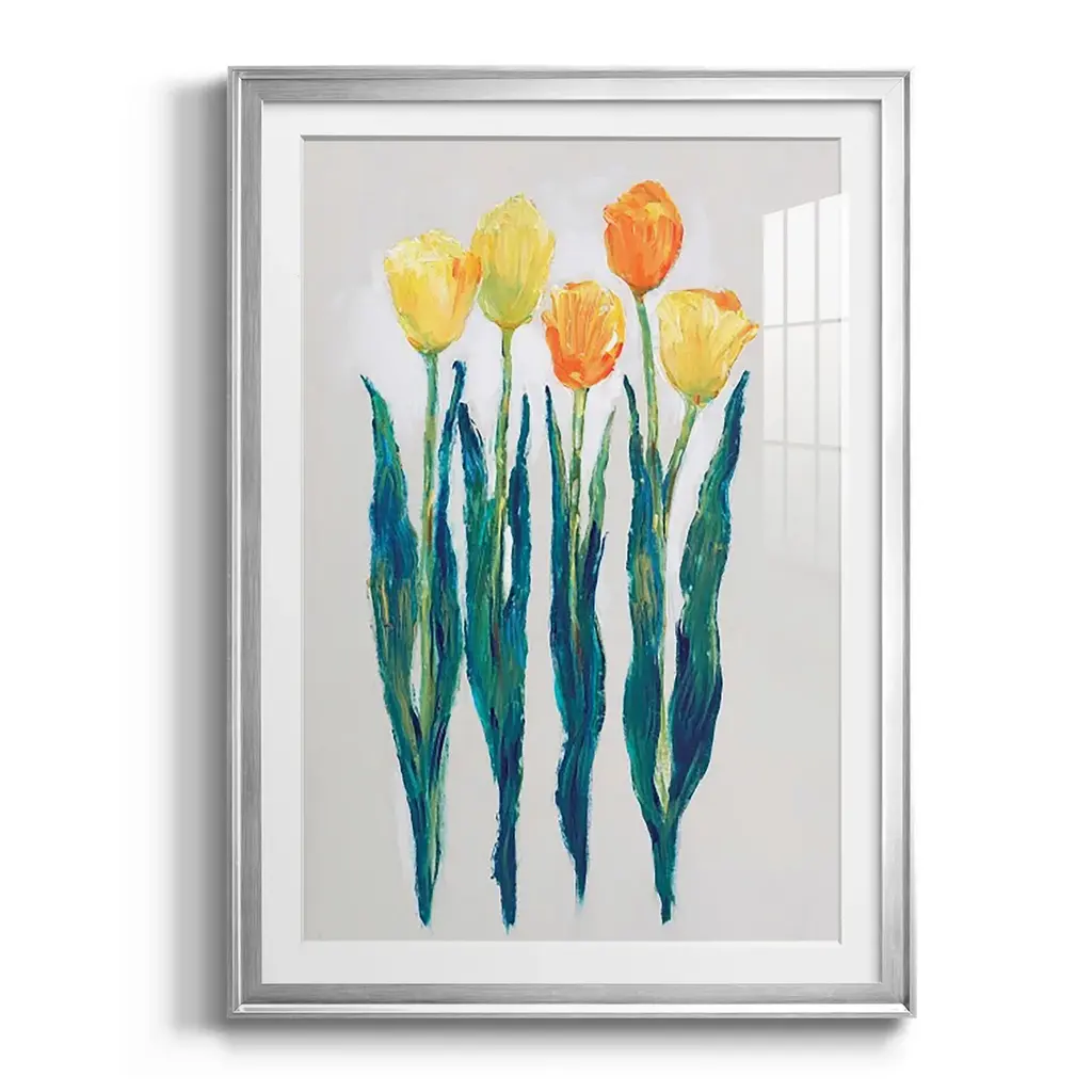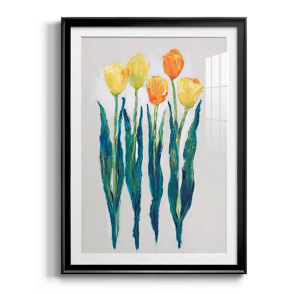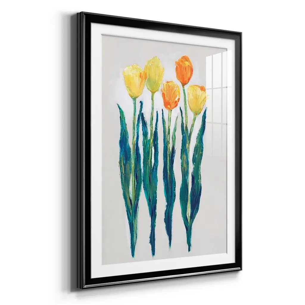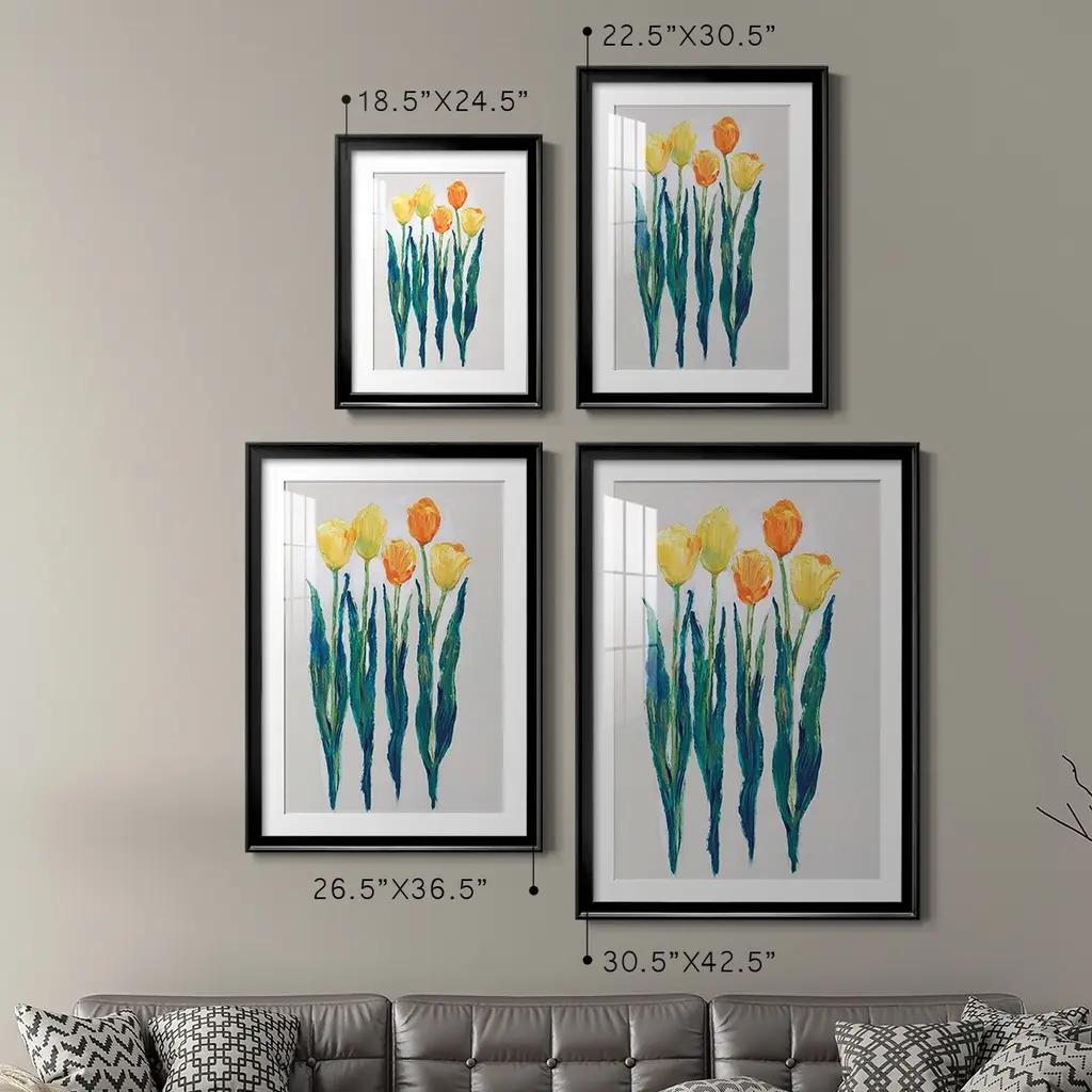 Tulips in a Row II Premium Framed Print - Ready to Hang A Premium Framed Print created to last. Framed in distressed wood and available in an array of sizes and colors Featuring a beveled a solid wood stretcher bar, each piece comes ready to hand 4 SIZES AVAILABLE 30.5''X42.5'' - Overall Size 26.5'X36.5'' - Overall Size 22.5''x30.5'' - Overall Size 18.5''x24.5'' - Overall Size Each piece is made to order. Each piece comes with hanging hardware. Made in the USA Ready to Hang Giclee Paper Print Acrylic Glass Beveled Matt Board