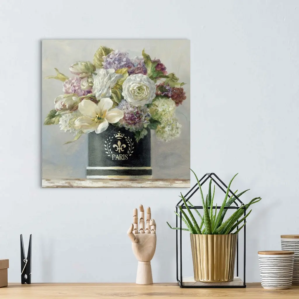 Contemporary painting of a bouquet of flowers in a planter, sitting on a table.
