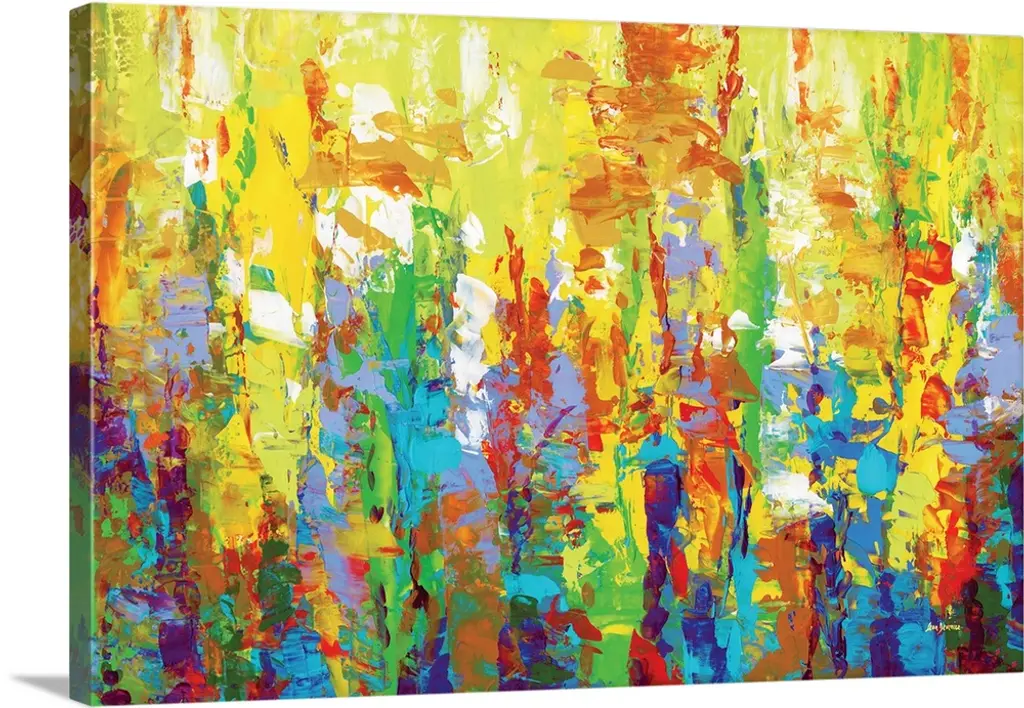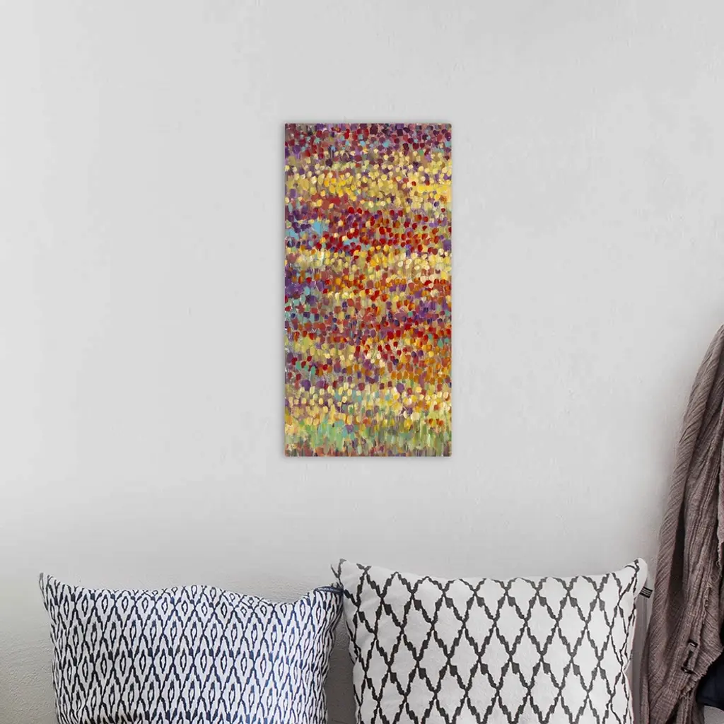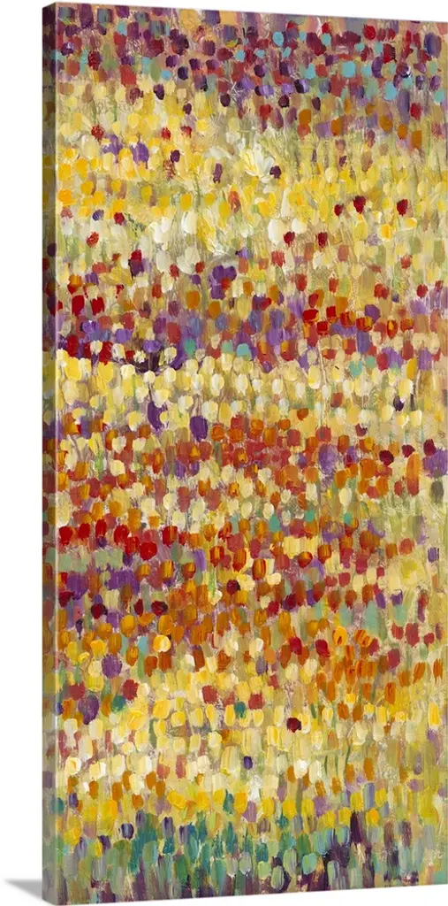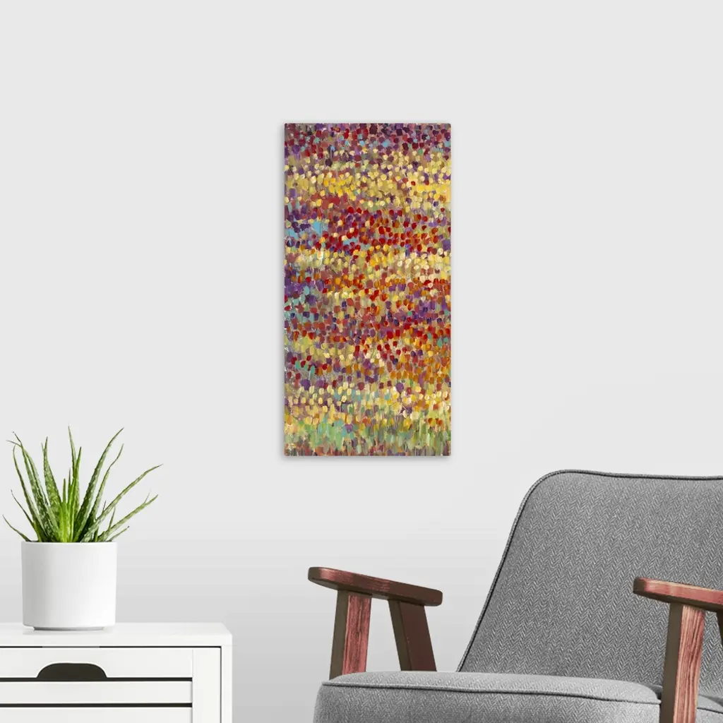 Vertical contemporary painting of a field of tulips in bright, colorful dots of colors in an impressionism style.