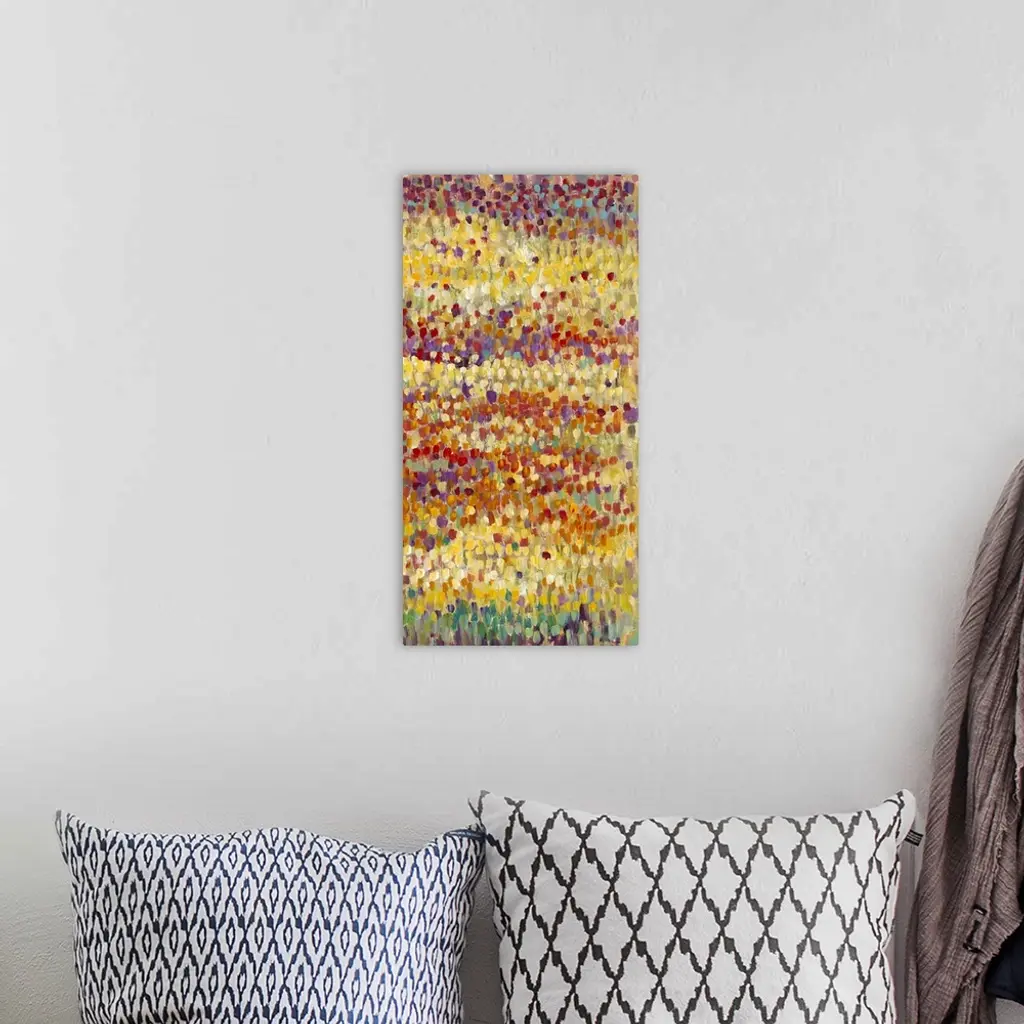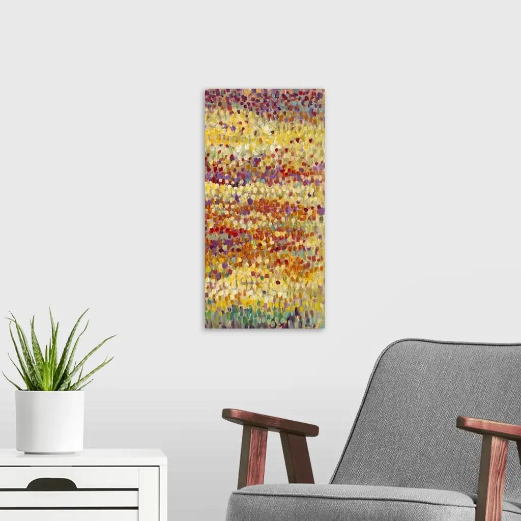 Vertical contemporary painting of a field of tulips in bright, colorful dots of colors in an impressionism style.