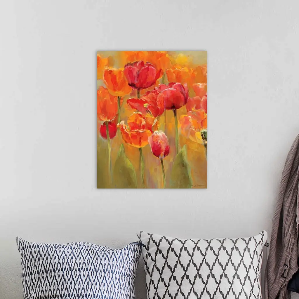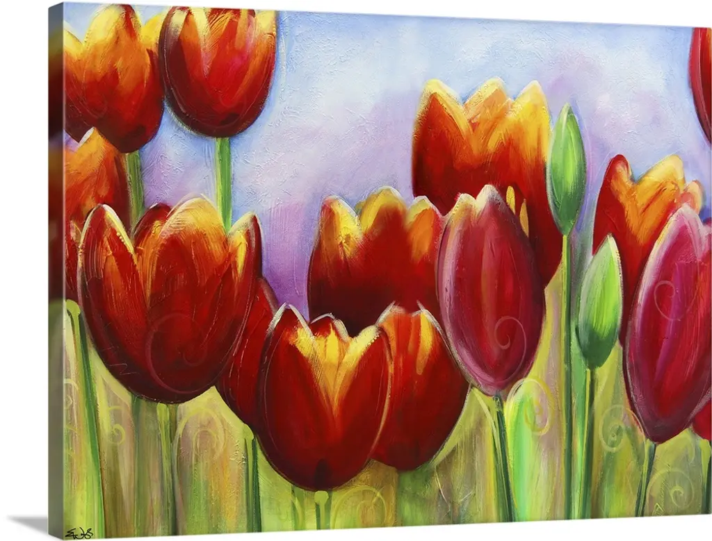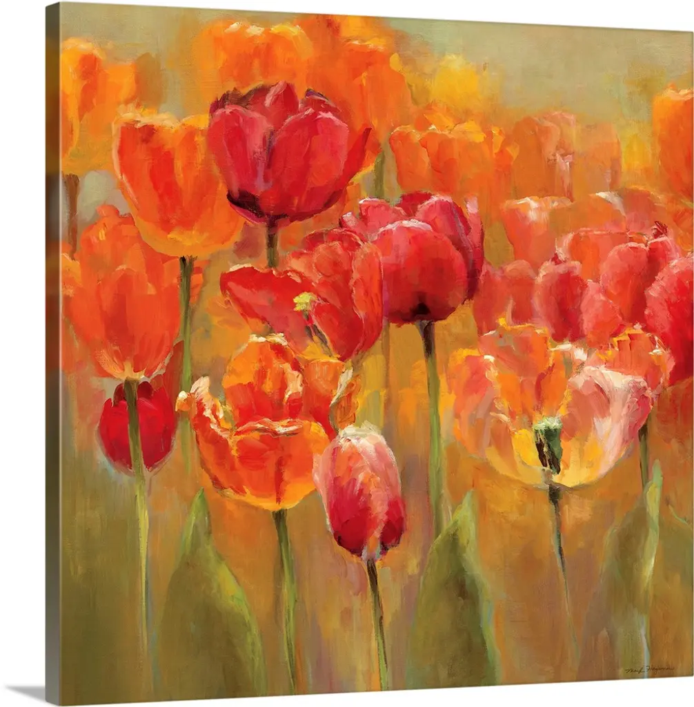 Luminous painting of blooming flowers, light reflecting off the edge of their petals.