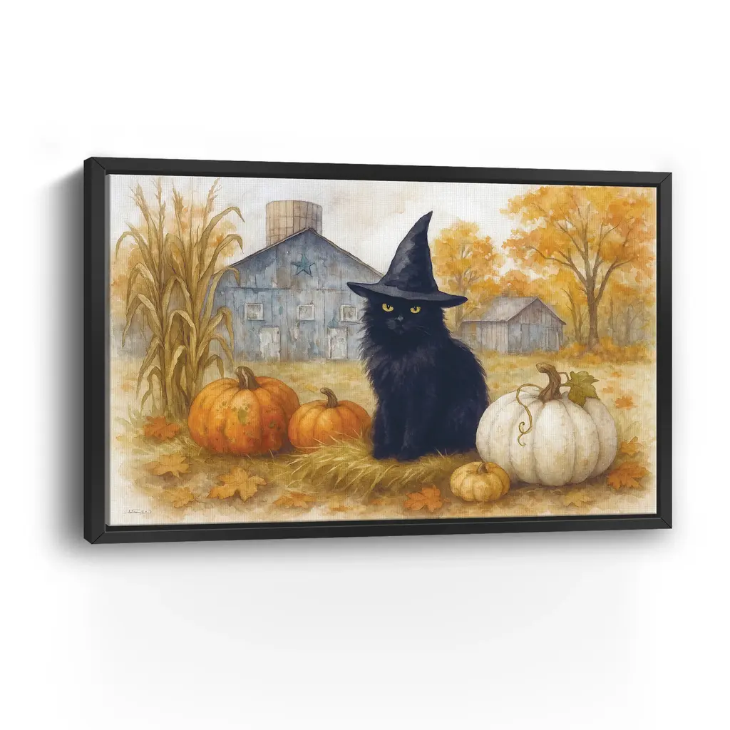 A mysterious black cat in a pointed witch hat sits proudly among pumpkins and golden leaves in a rustic farmyard. Warm tones of amber, ivory, and midnight black create a cozy yet enchanting Halloween scene. Our Gallery Wrap Canvas Prints are proudly assembled with high quality materials in California, USA. Each piece is printed on a thick, archival grade canvas using Giclee technology. It is then hand-stretched by our experienced artisans over solid wood bars, which will not warp over time. The final product is a piece personally crafted for you to confidently display on your wall. Care and Assembly: Ensure that the location of your piece has little to no exposure to heat, sunlight, and moisture. Wipe clean, only if needed. Each piece includes hanging hardware to hang on your wall horizontally.