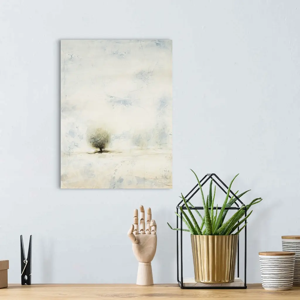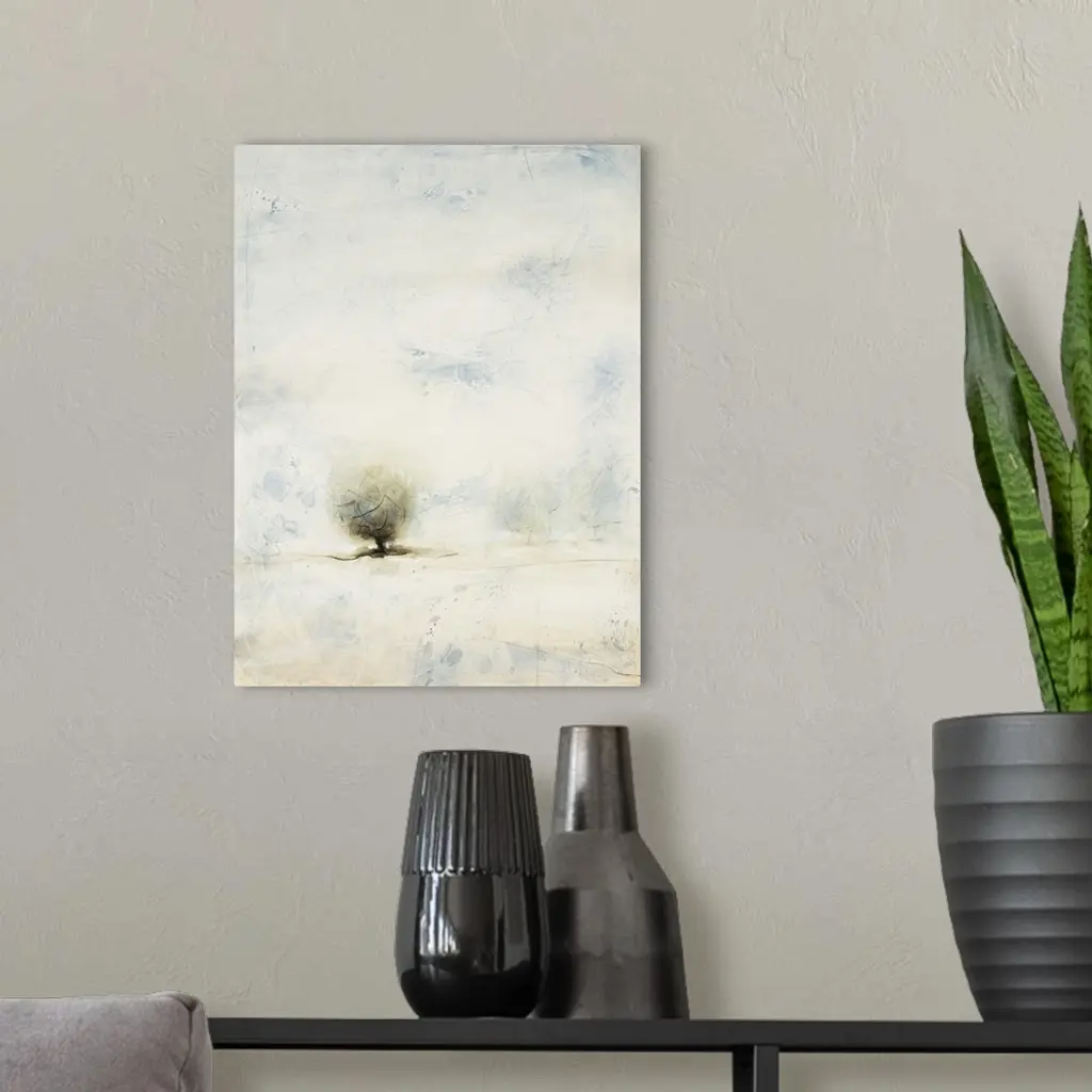 Pastel landscape painting of a tree in the misty countryside.