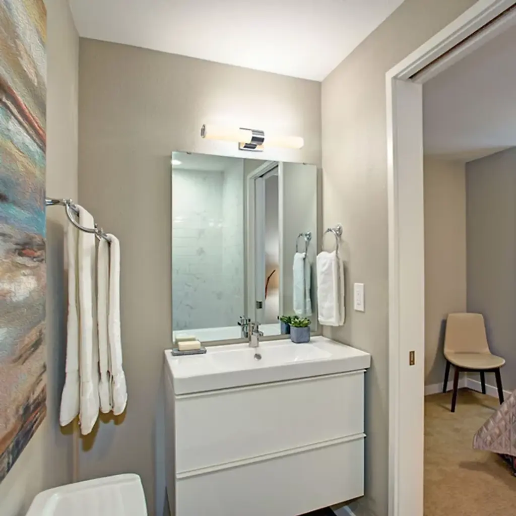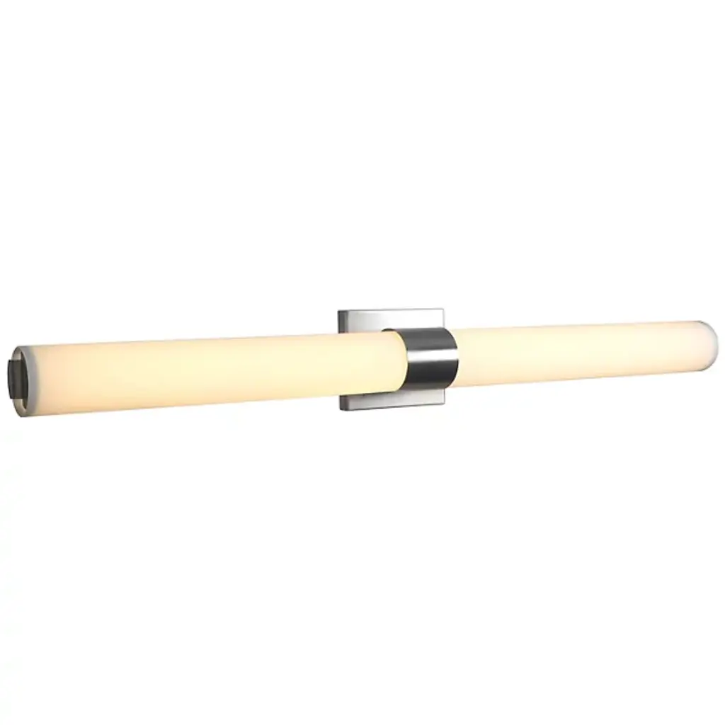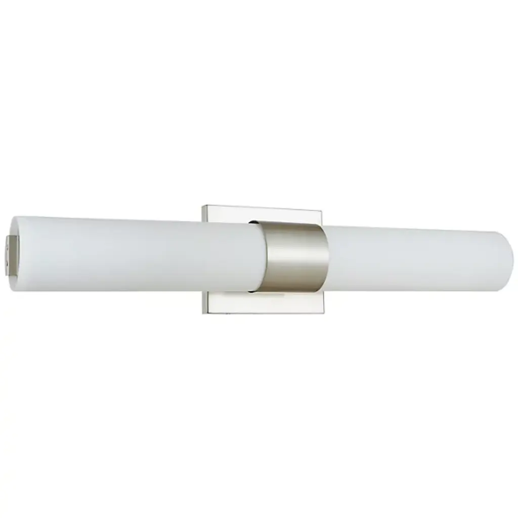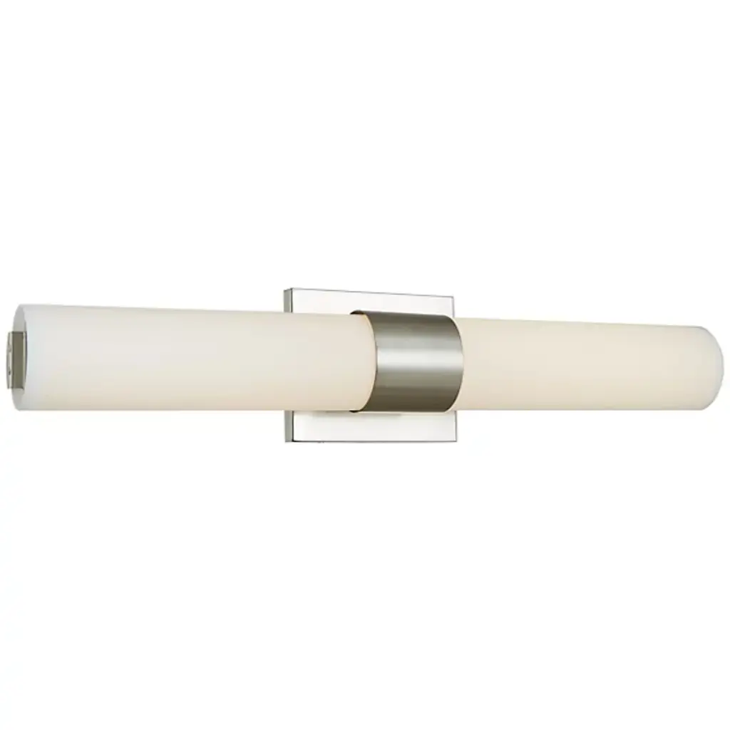 Light up your lavatory with the Turbo Dual Cylinder LED Vanity Light from Abra. A durable backplate supports a pair of LEDs which are neatly enveloped and held together by a metallic band. The elongated nature of this light fixture allows for perfect placement above any mirror. This vanity light decoratively hangs from your wall while illuminating the room. Complete your grooming routine before the glowing shine from an opal shade. The bathbar’s muted style maintains your bathroom’s contemporary aesthetic.