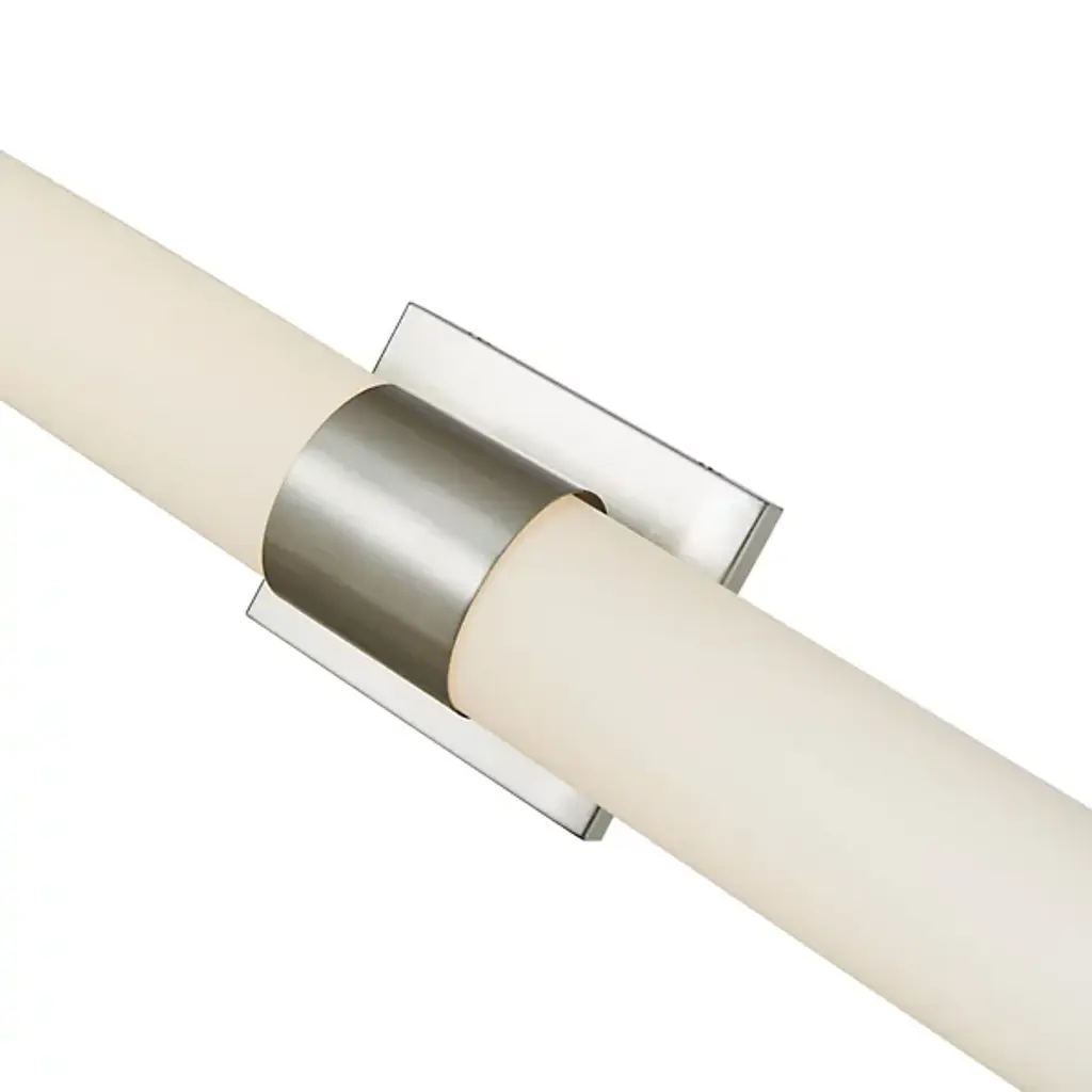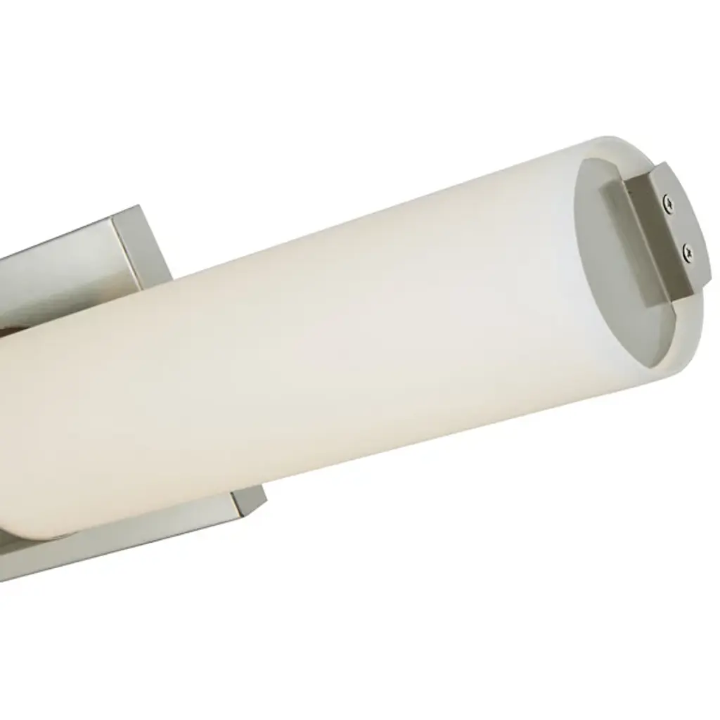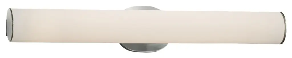 Light up your lavatory with the Turbo Dual Cylinder LED Vanity Light from Abra. A durable backplate supports a pair of LEDs which are neatly enveloped and held together by a metallic band. The elongated nature of this light fixture allows for perfect placement above any mirror. This vanity light decoratively hangs from your wall while illuminating the room. Complete your grooming routine before the glowing shine from an opal shade. The bathbar’s muted style maintains your bathroom’s contemporary aesthetic.