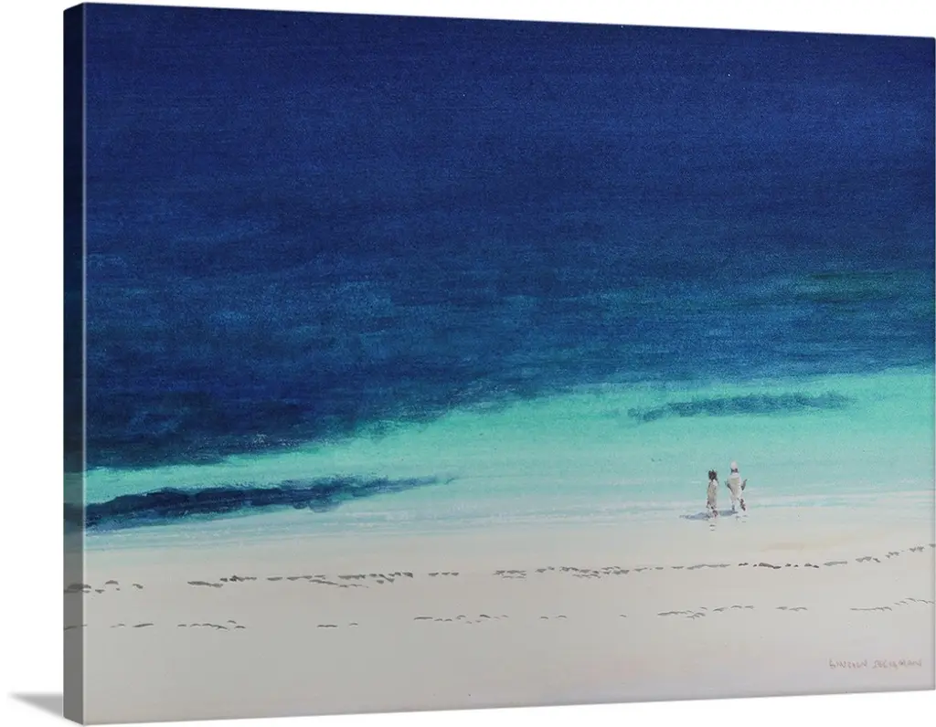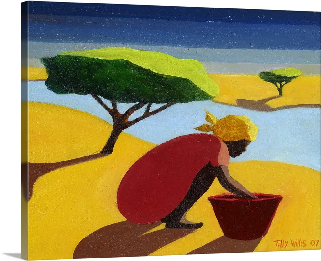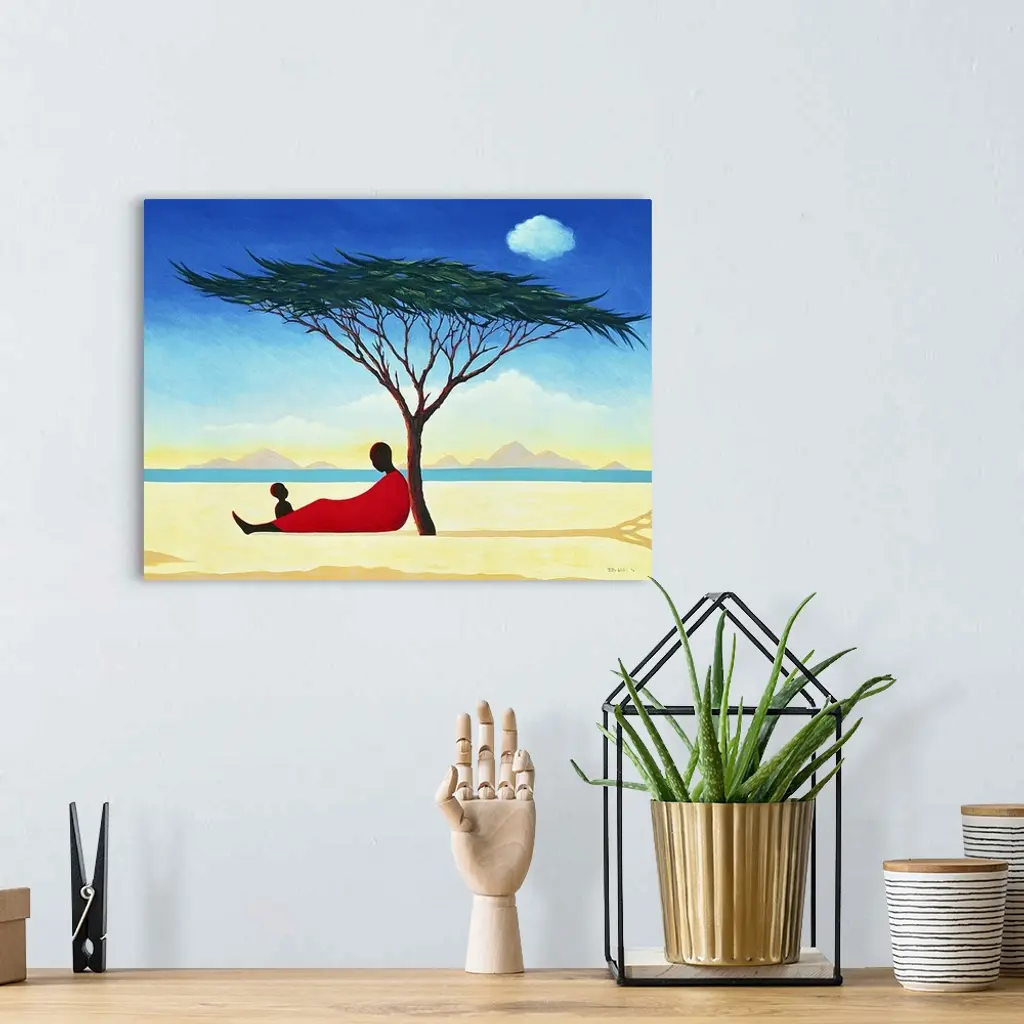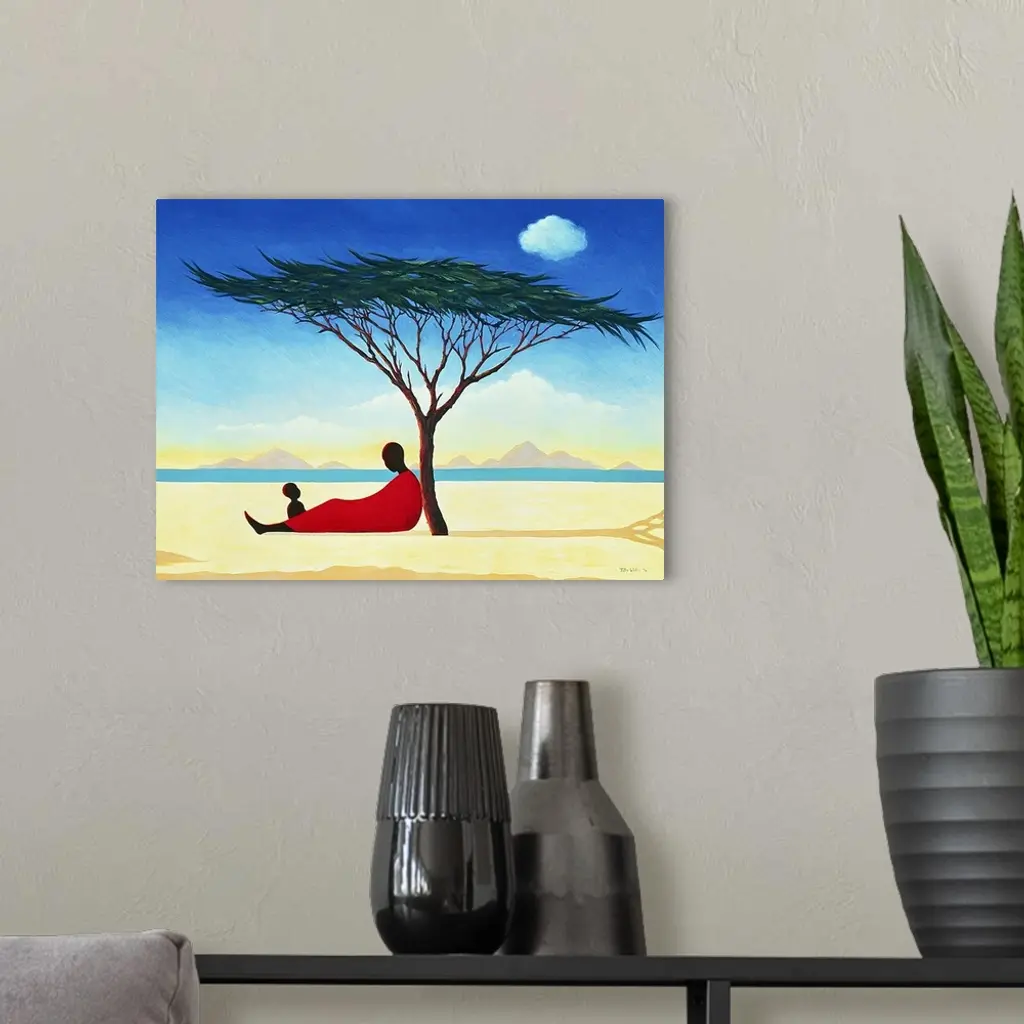 A contemporary art piece of a woman sitting under a tree with her child as water and mountains can be seen in the distance.