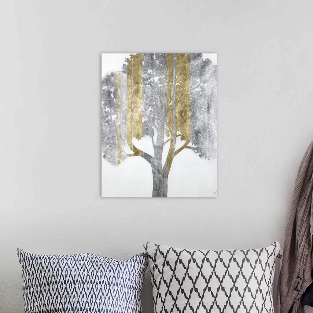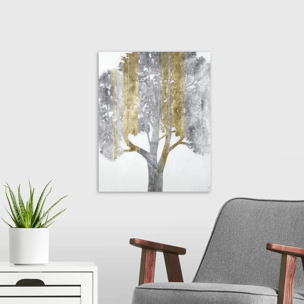 A modern painting of a single tree in silver with vertical streaks of gold.