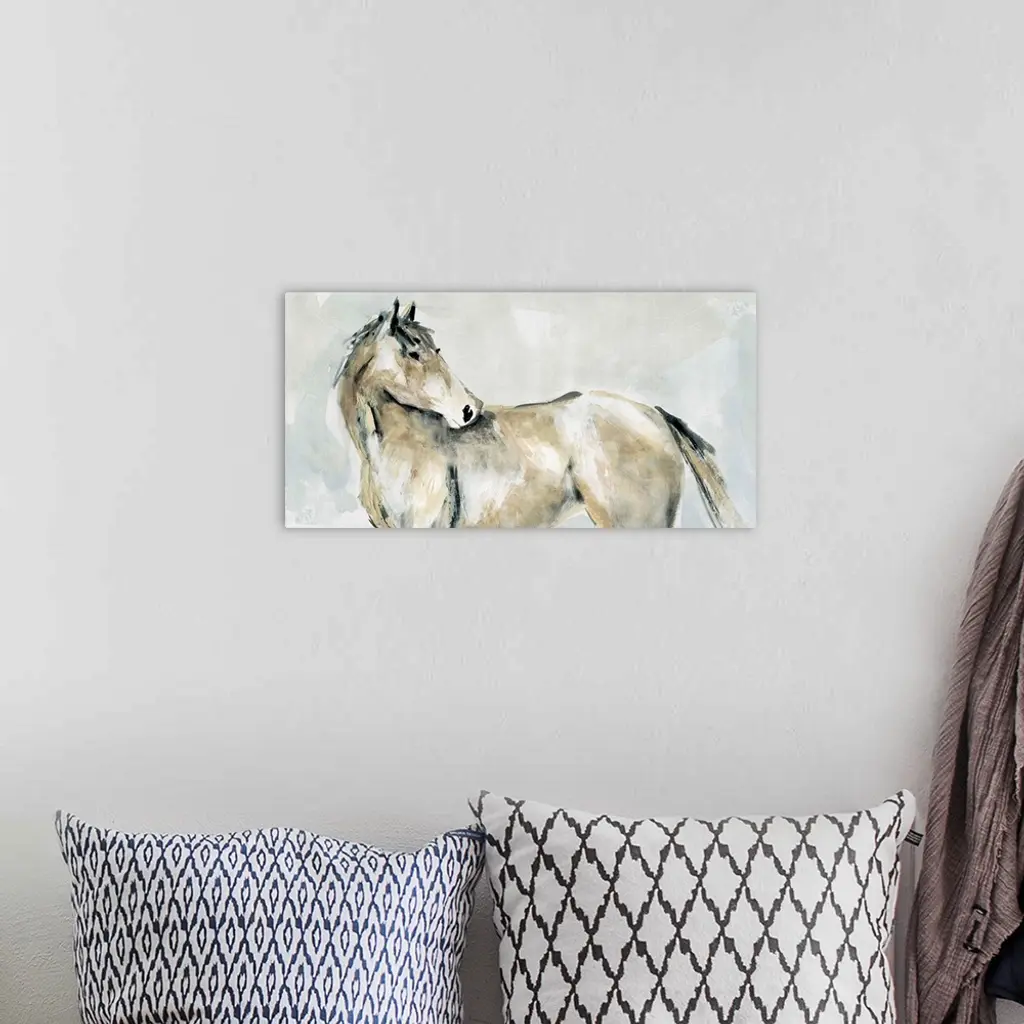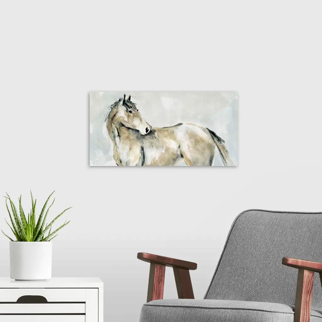 Dry brushstrokes in subdued colors illustrate a horse turning to look behind in this painting.