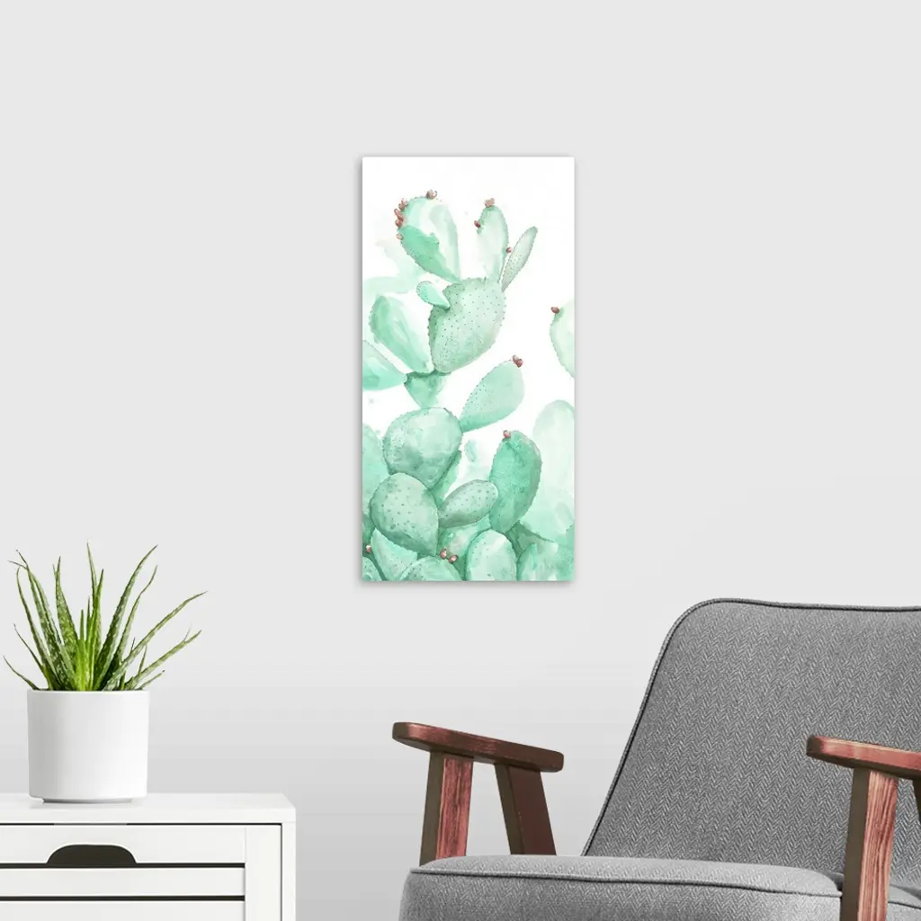 A contemporary watercolor painting of a vibrant green cactus against a white background.