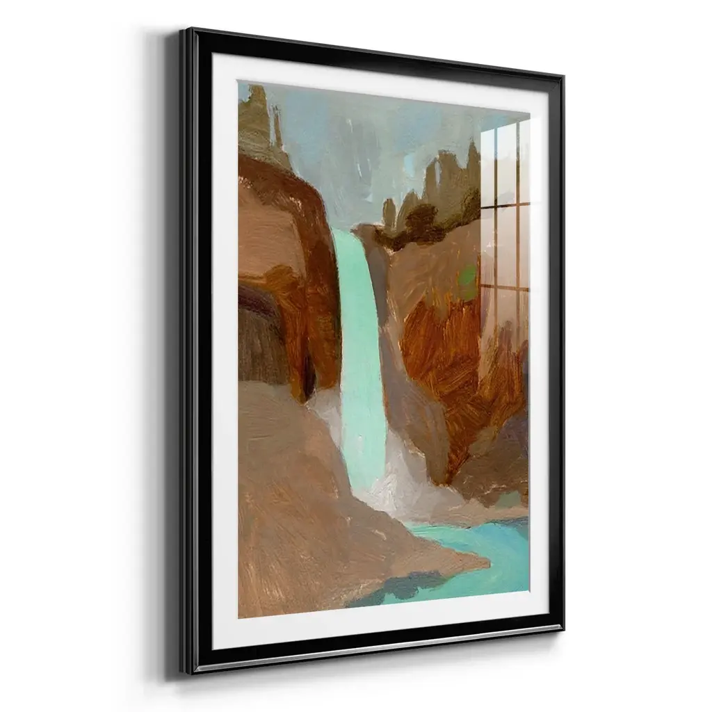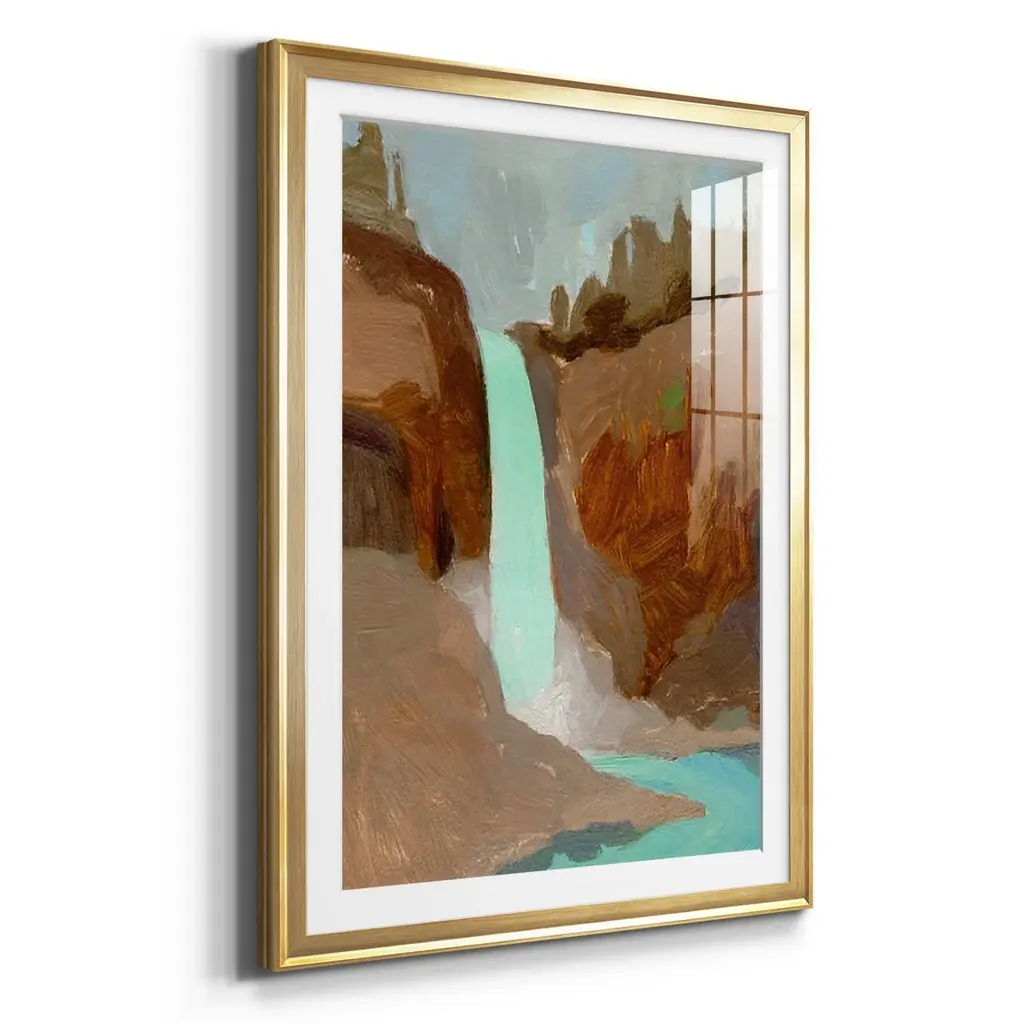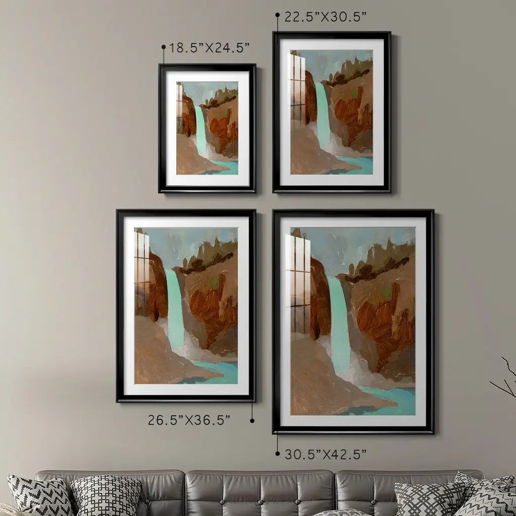 Turquoise Falls I Premium Framed Print - Ready to Hang A Premium Framed Print created to last. Framed in distressed wood and available in an array of sizes and colors Featuring a beveled a solid wood stretcher bar, each piece comes ready to hand 4 SIZES AVAILABLE 30.5''X42.5'' - Overall Size 26.5'X36.5'' - Overall Size 22.5''x30.5'' - Overall Size 18.5''x24.5'' - Overall Size Each piece is made to order. Each piece comes with hanging hardware. Made in the USA Ready to Hang Giclee Paper Print Acrylic Glass Beveled Matt Board