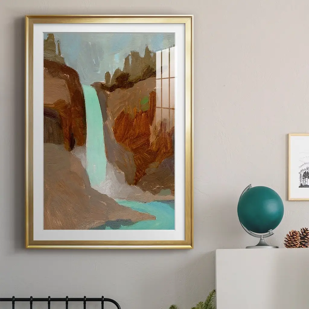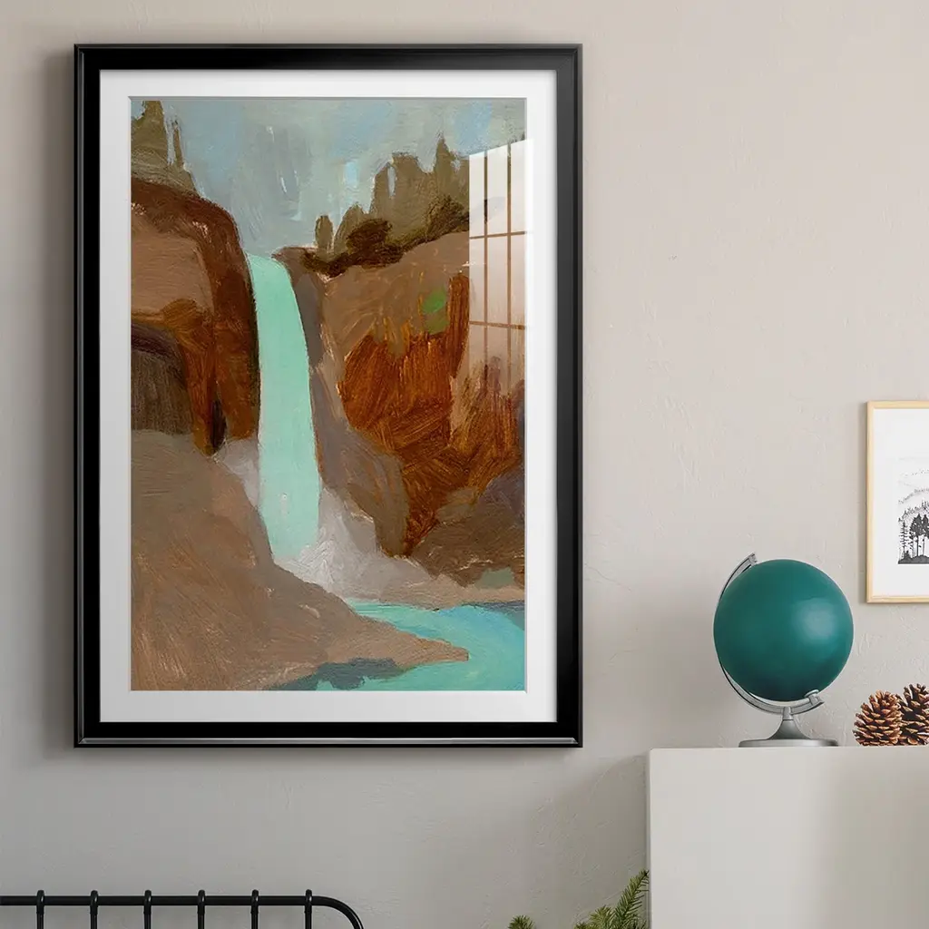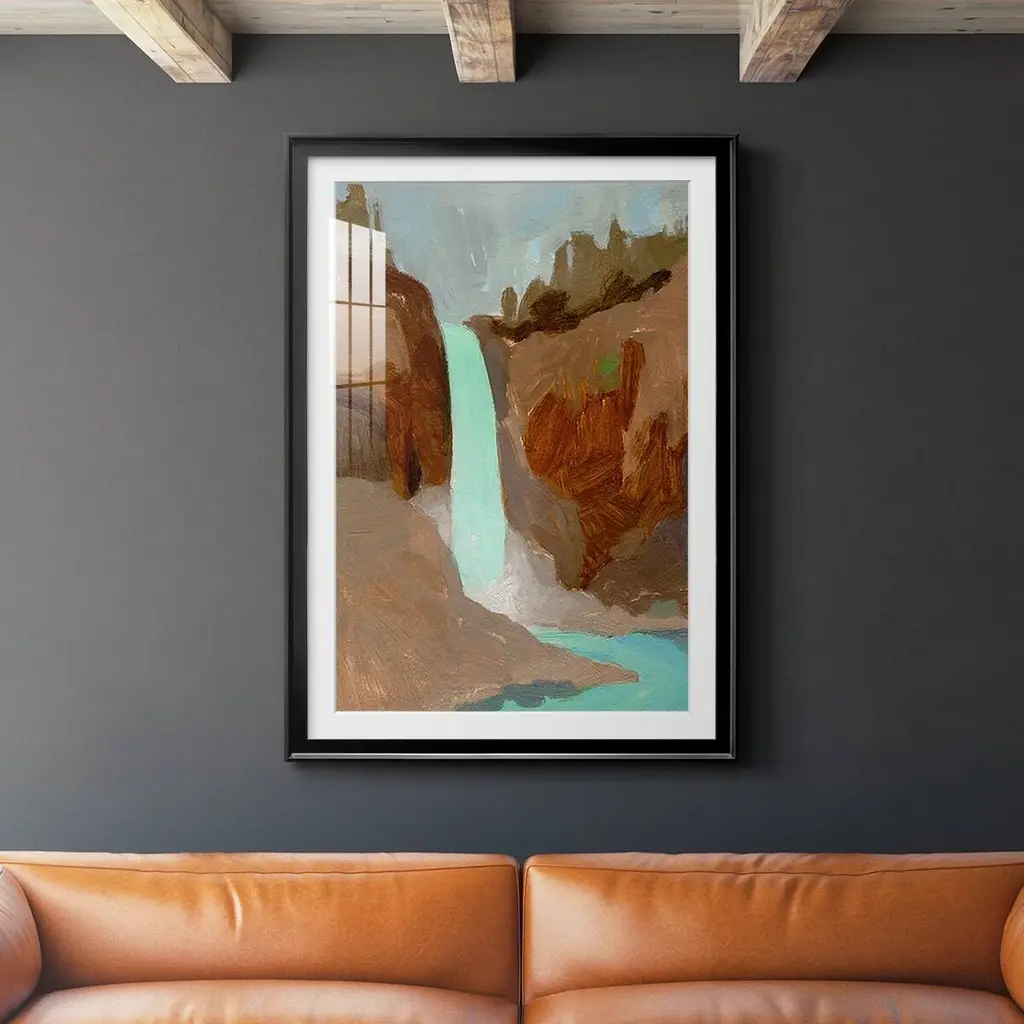 Turquoise Falls I Premium Framed Print - Ready to Hang A Premium Framed Print created to last. Framed in distressed wood and available in an array of sizes and colors Featuring a beveled a solid wood stretcher bar, each piece comes ready to hand 4 SIZES AVAILABLE 30.5''X42.5'' - Overall Size 26.5'X36.5'' - Overall Size 22.5''x30.5'' - Overall Size 18.5''x24.5'' - Overall Size Each piece is made to order. Each piece comes with hanging hardware. Made in the USA Ready to Hang Giclee Paper Print Acrylic Glass Beveled Matt Board