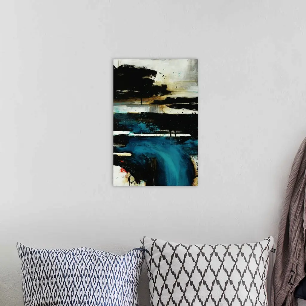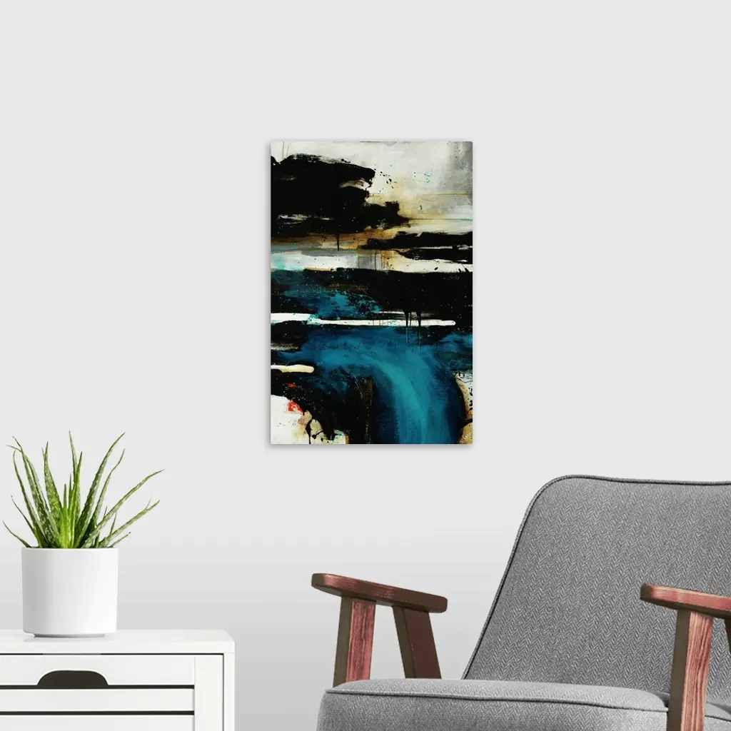 Vertical panoramic contemporary abstract artwork of messy dripping horizontal bands overlain with splashes of paint.