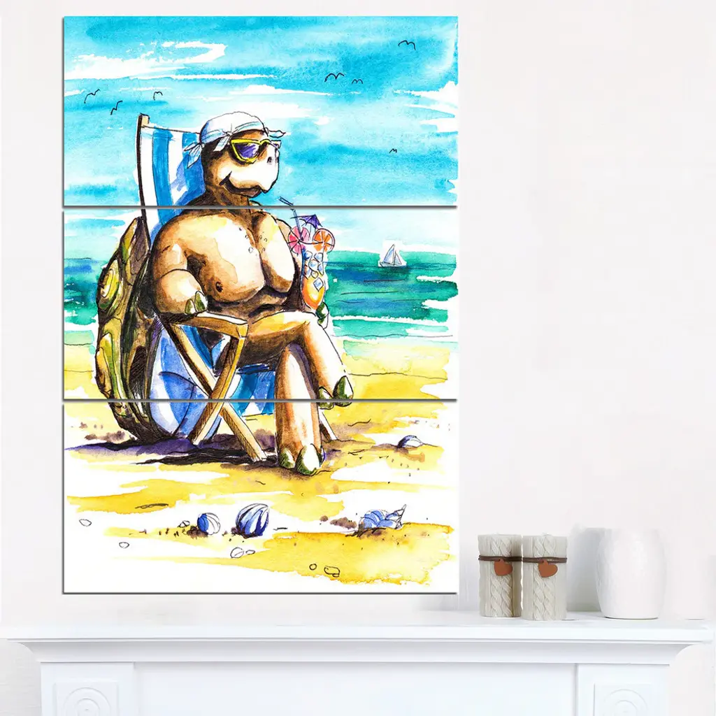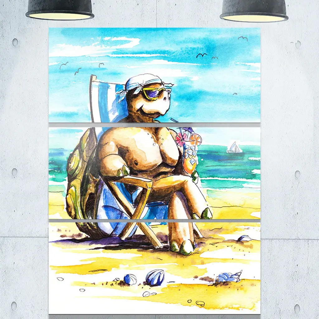 "Turtle Enjoying Holidays On Beach" Metal Wall Art, 3 Panels, 28"x36"