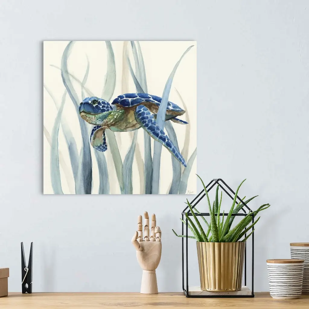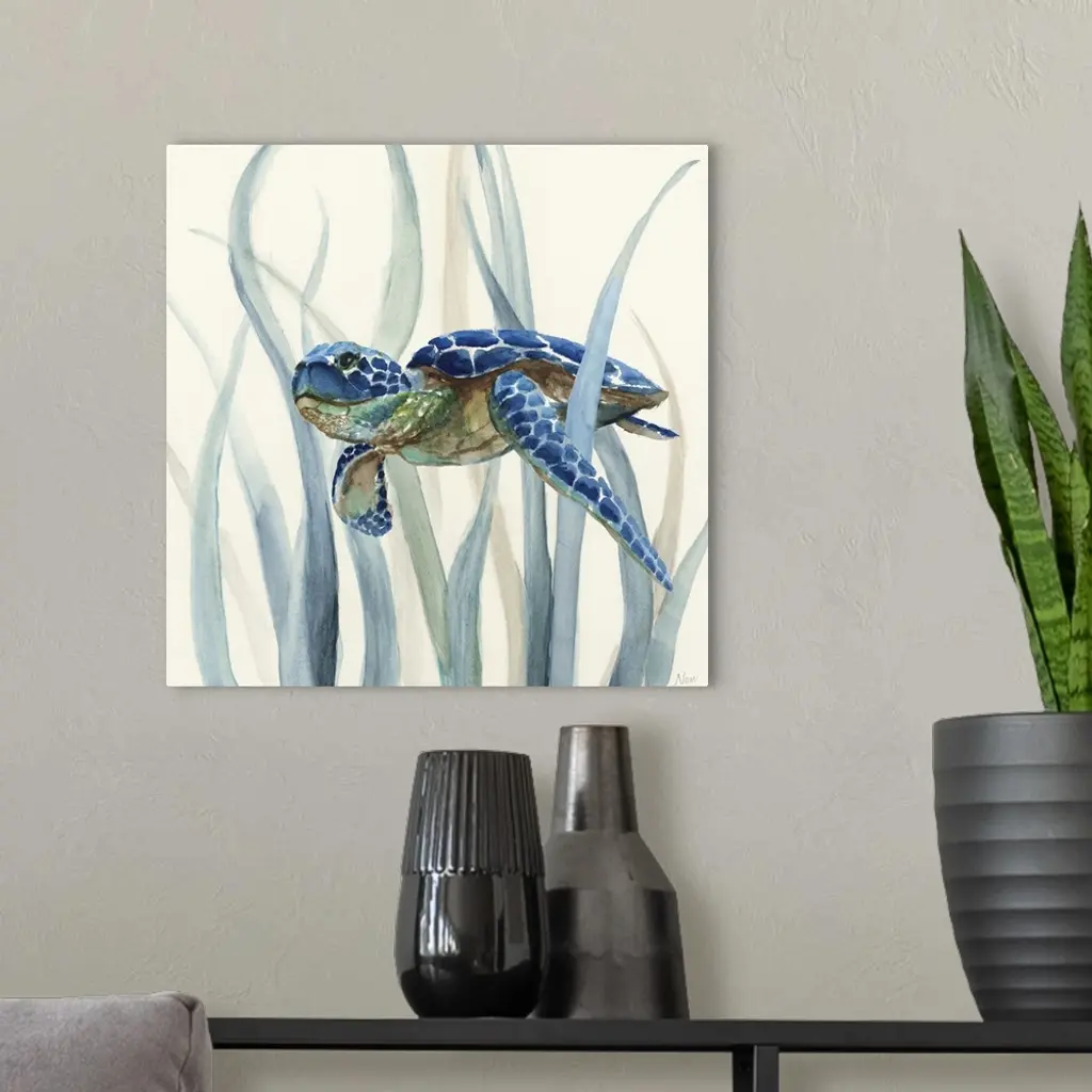 Square watercolor painting of an indigo, green, and brown sea turtle underwater in swimming through seagrass on an off white background.