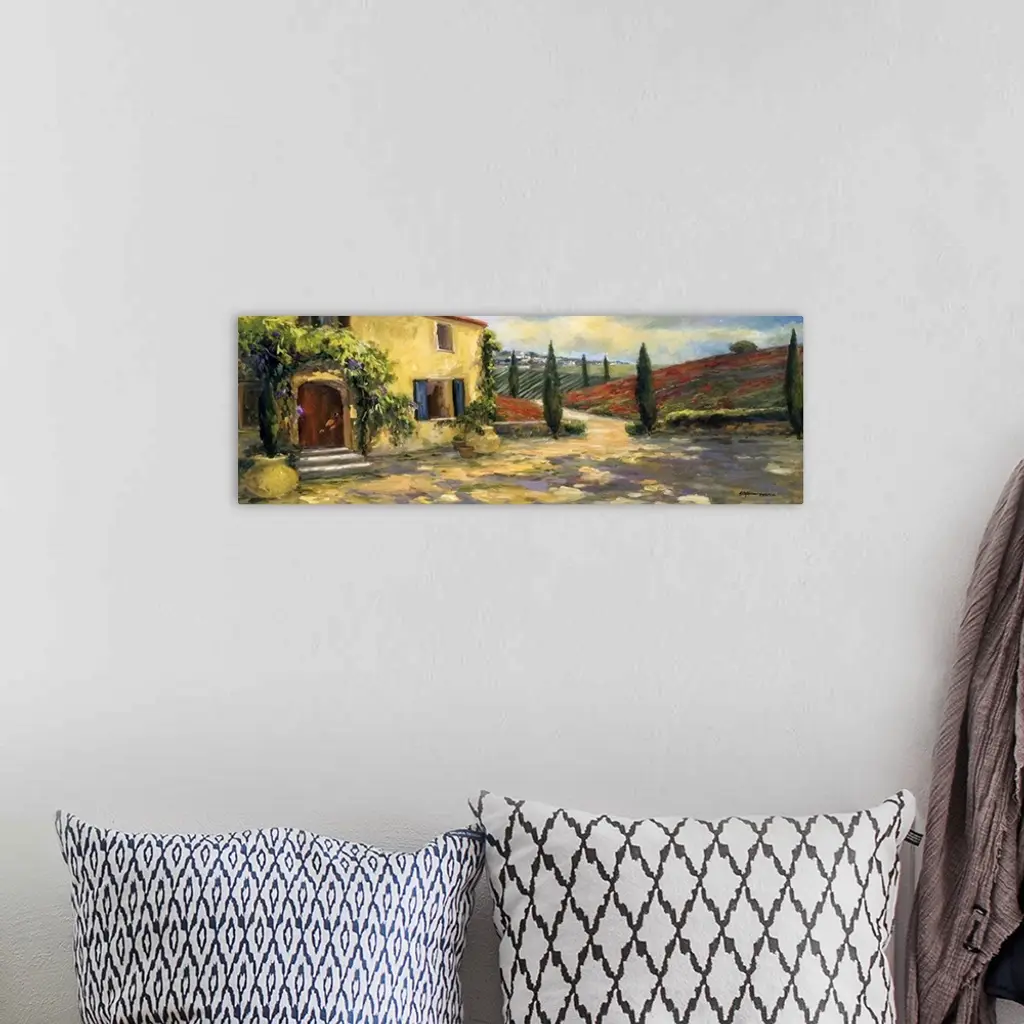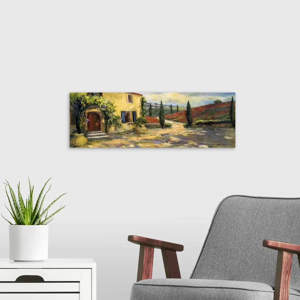 Fine art oil painting landscape of a Tuscan farmhouse with hills of red rising in the background by Allayn Stevens.