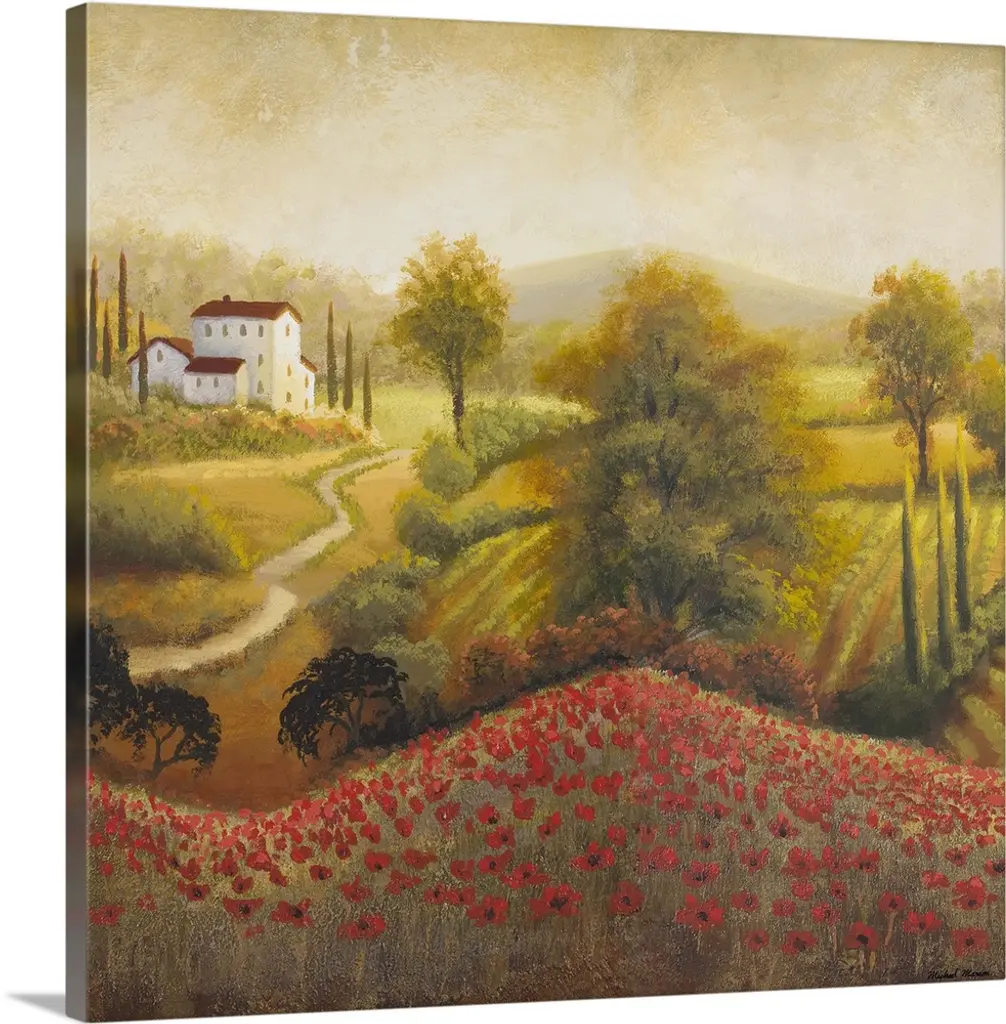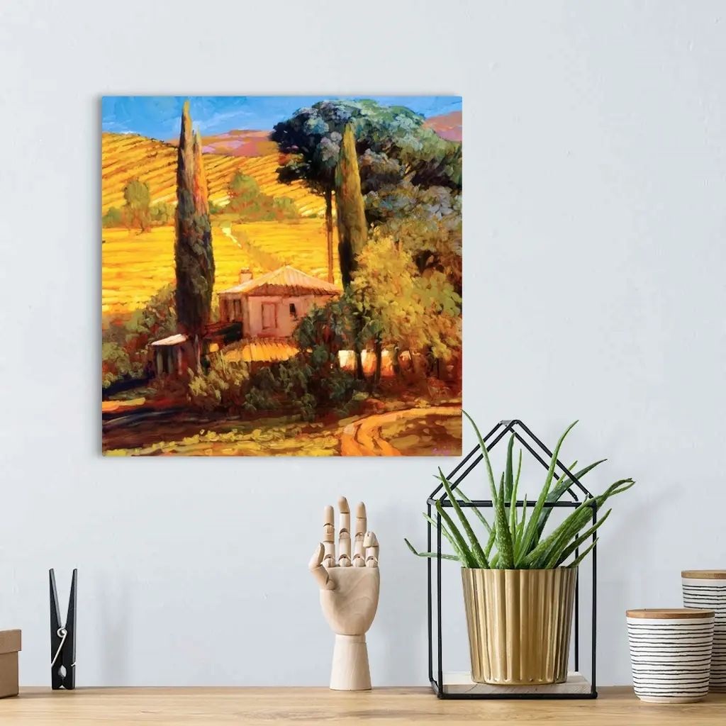 A contemporary painting of a Tuscany countryside, with rolling hills and houses.