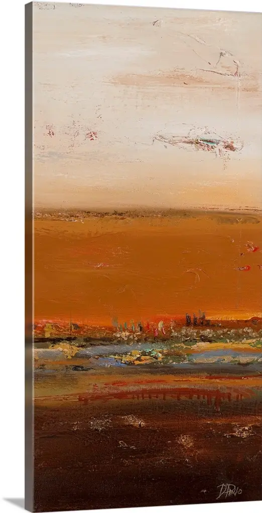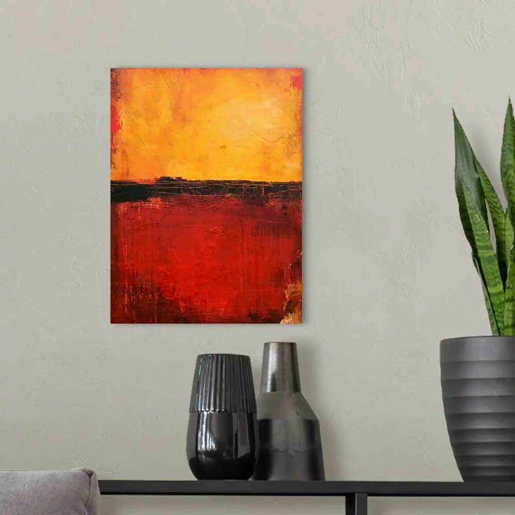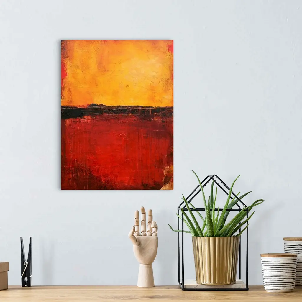Abstract artwork that has a dark horizontal stripe separating two warm colors. There is a distressed look to the piece with what appears to be scratches across it.