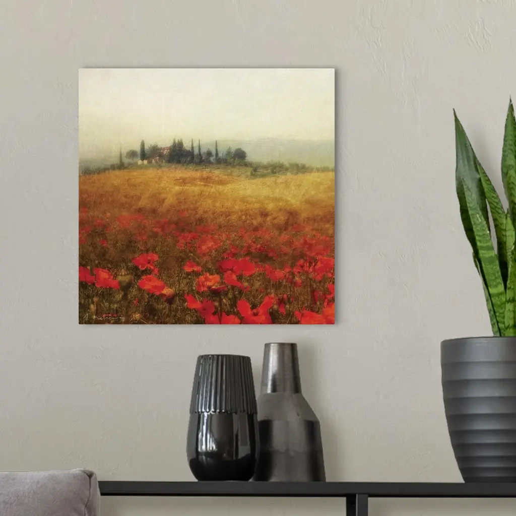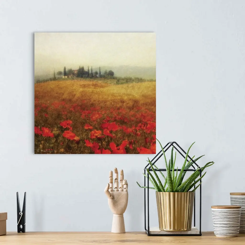 Painting of an Italian home nestled amongst a small grove of trees on a hill and a rolling field of bright red poppy flowers in the foreground.
