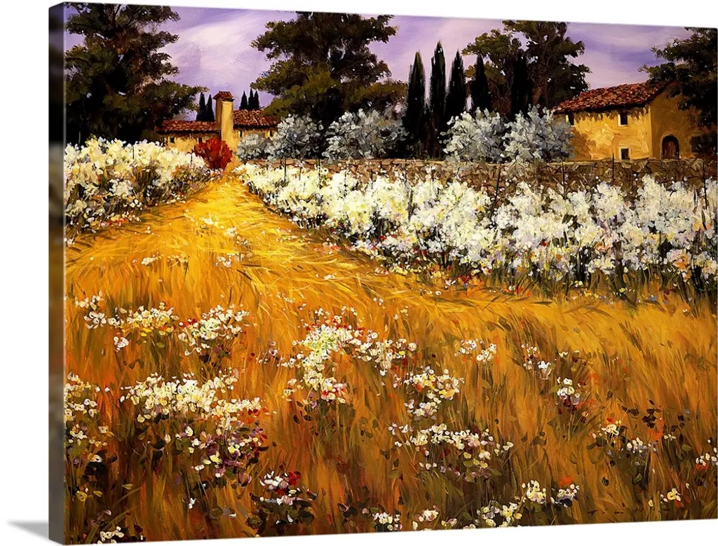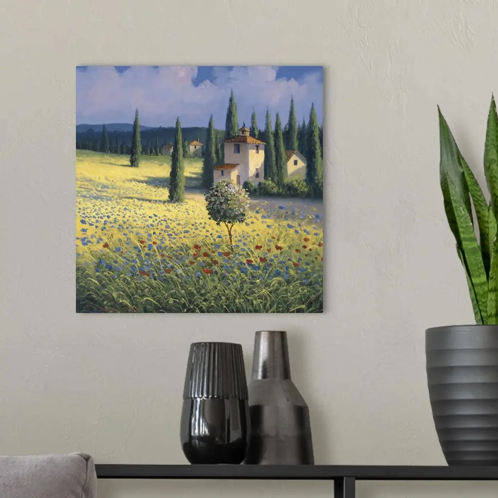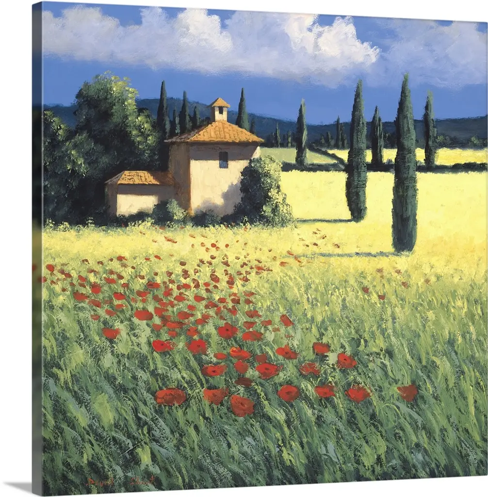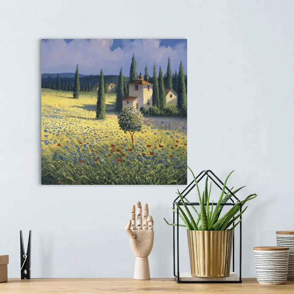 Landscape painting of a Tuscan hillside with tall cypress trees.
