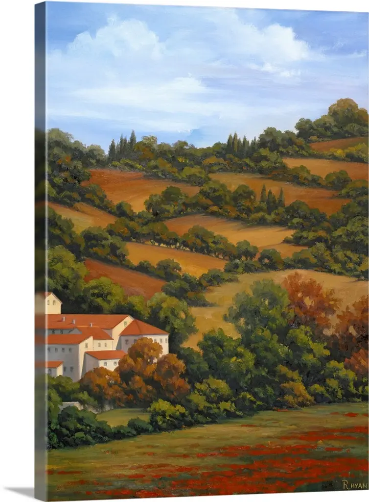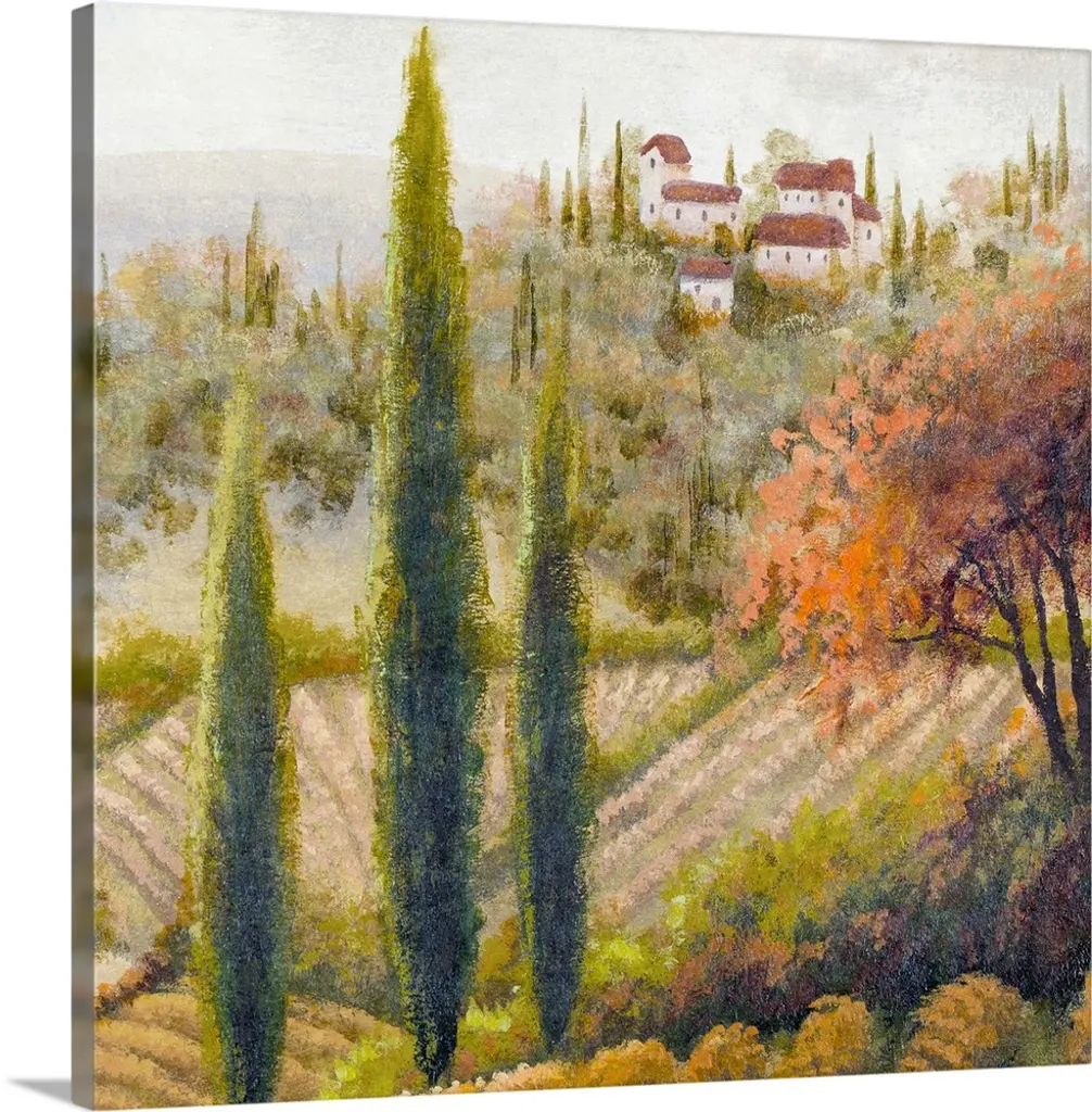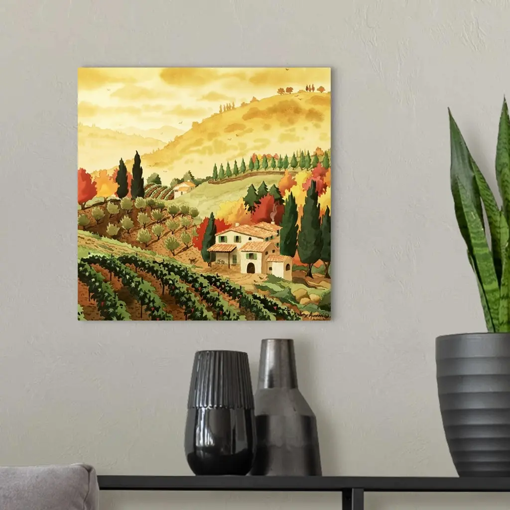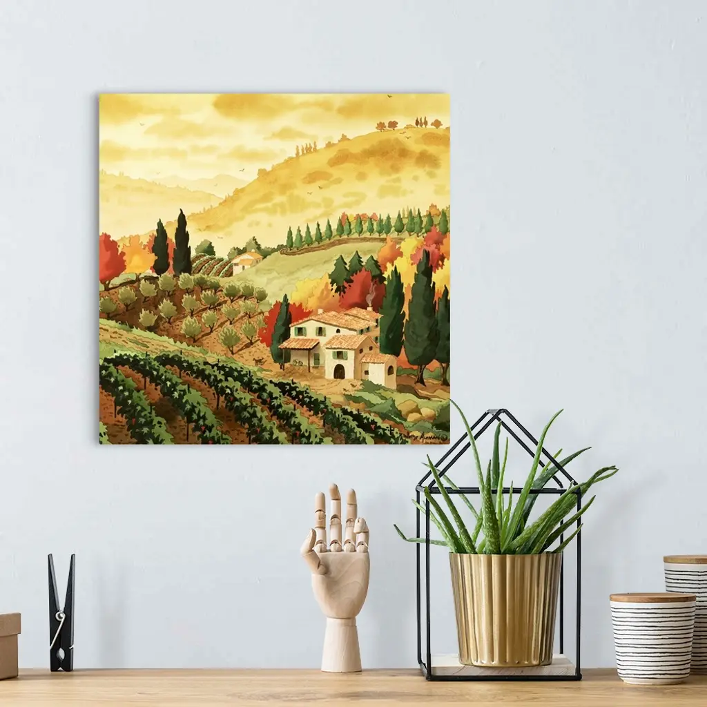 This square shaped decorative art is a contemporary, landscape painting showing a small villa nestled in the hills amongst vineyards and orchards.