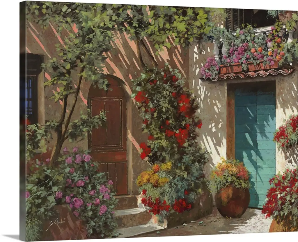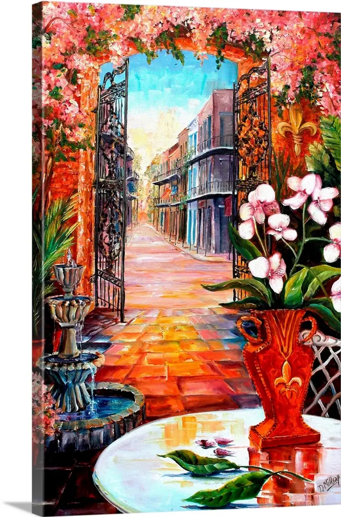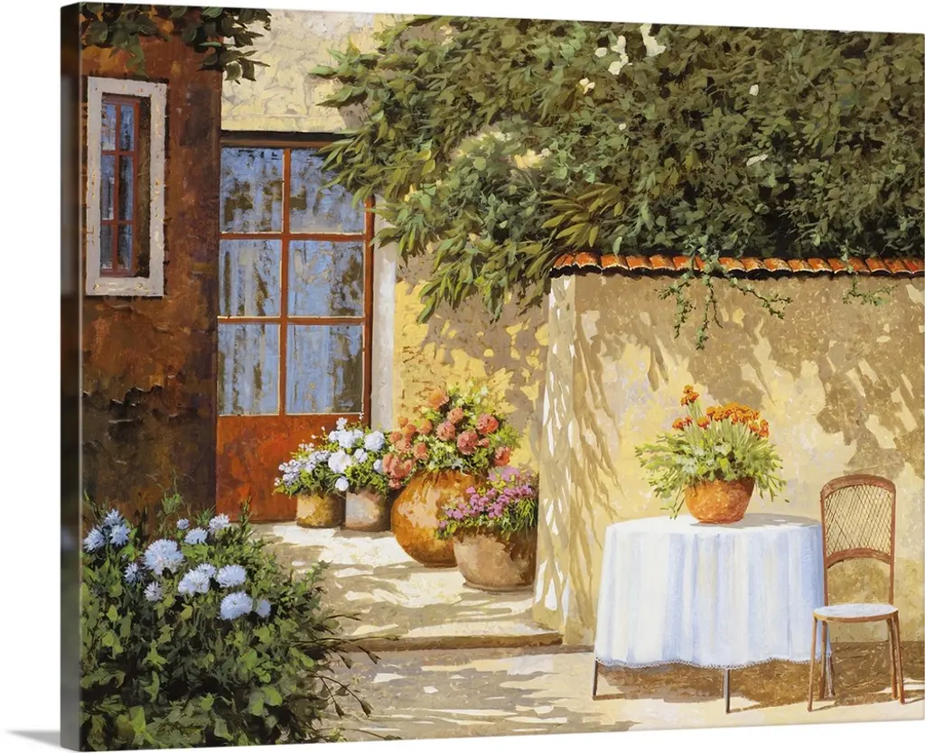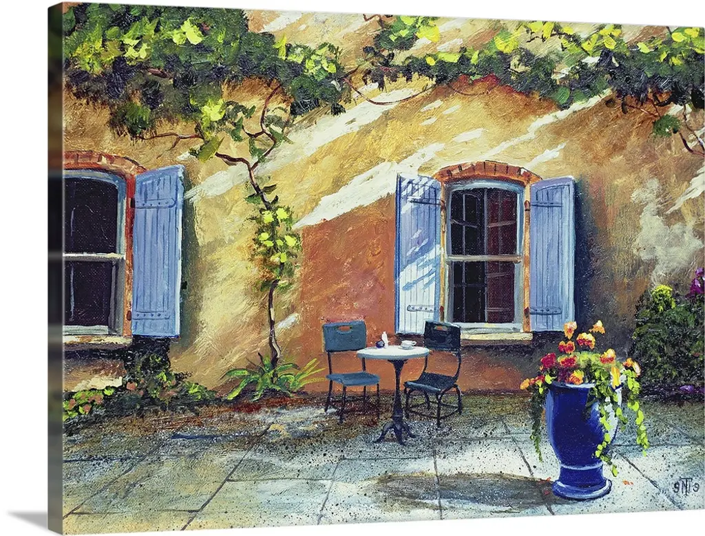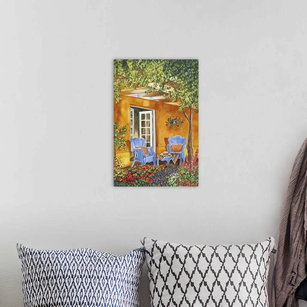 Contemporary painting of a Mediterranean patio with two comfortable chairs and a shady tree.