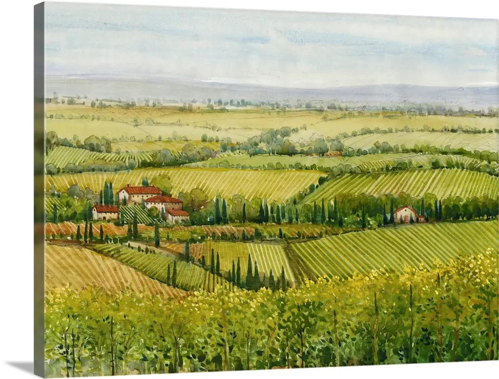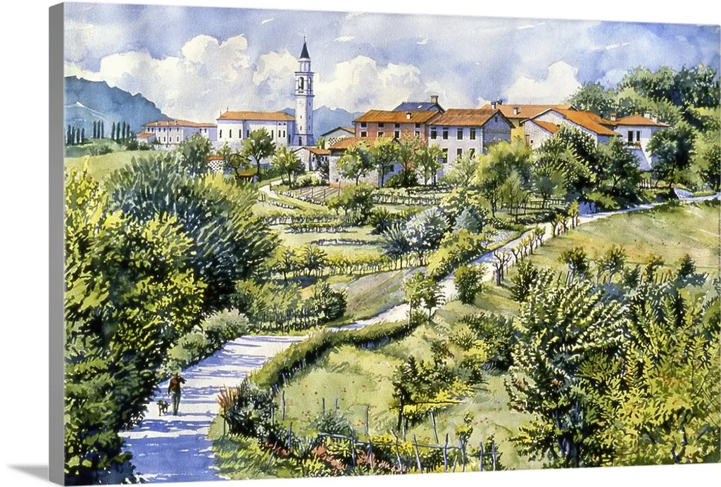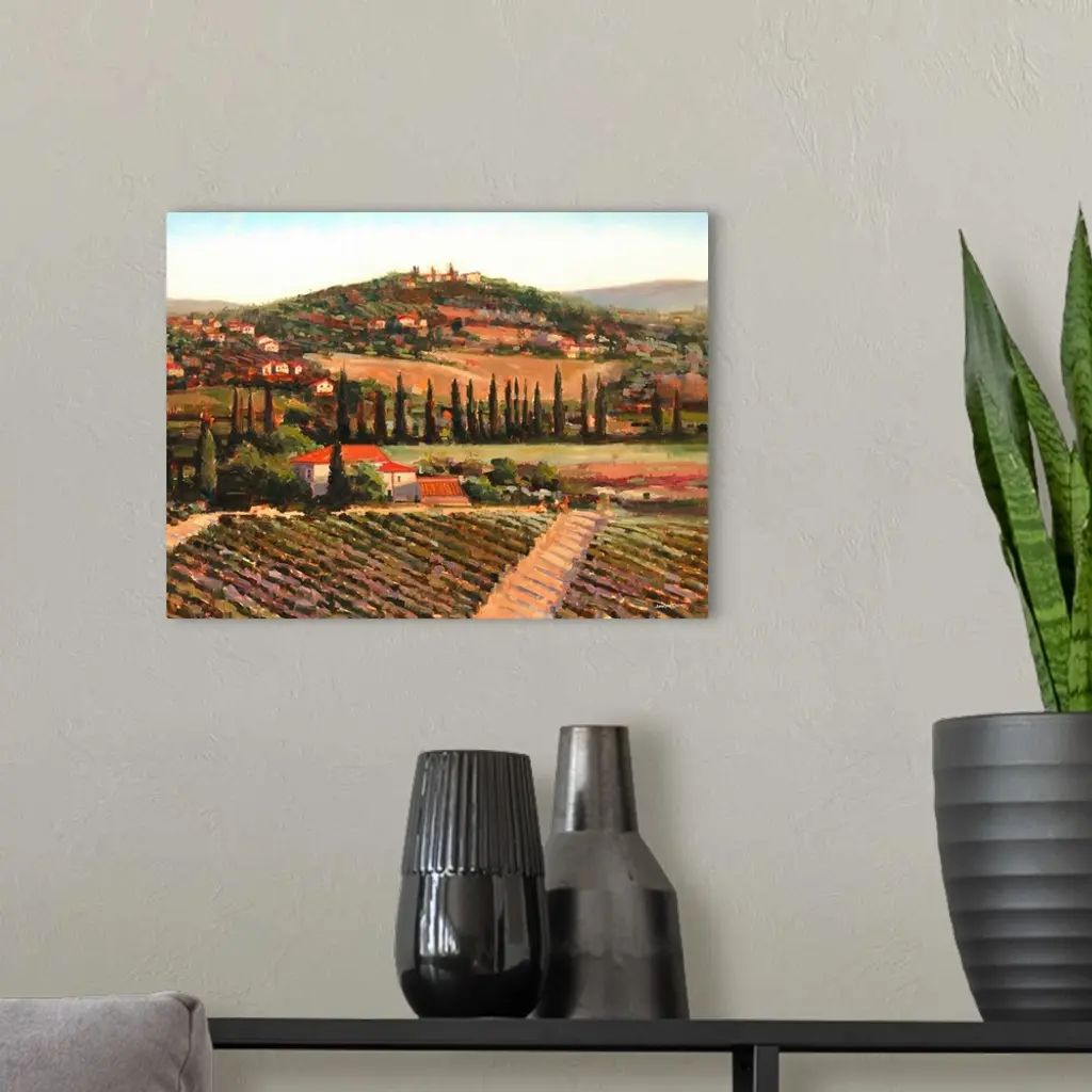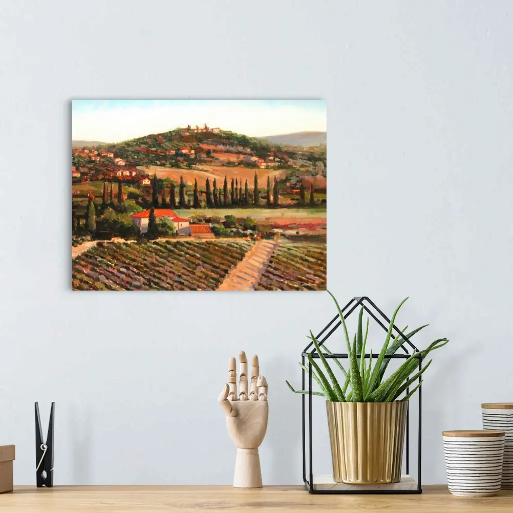 Contemporary painting of a Tuscan landscape at sunset with vineyards and a village made with warm tones.
