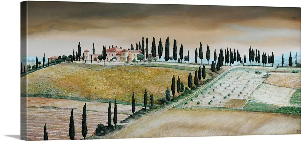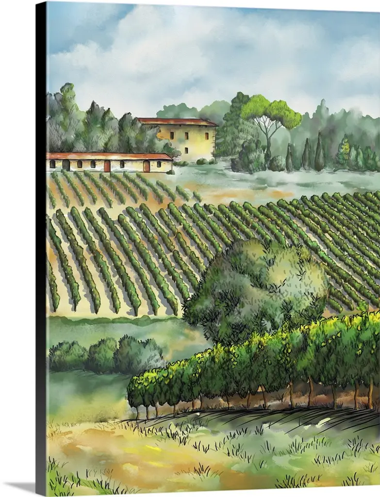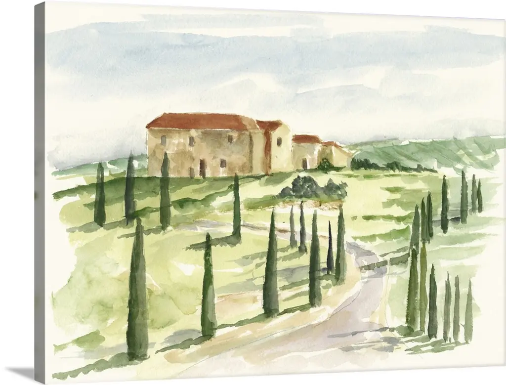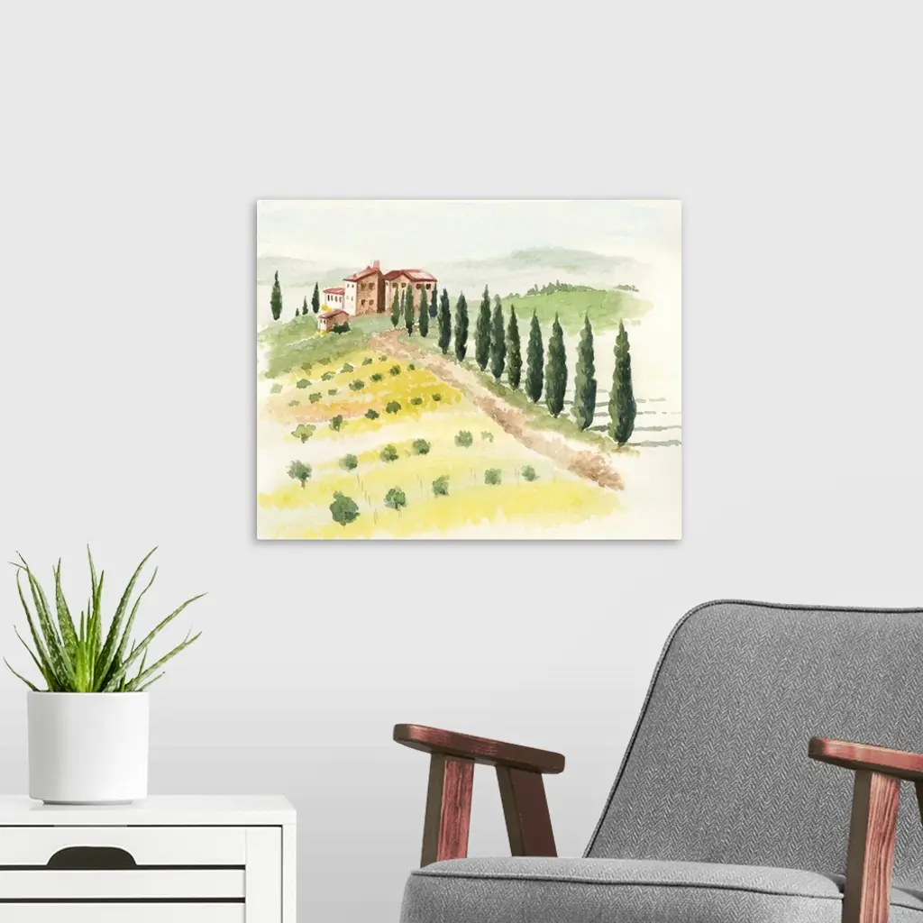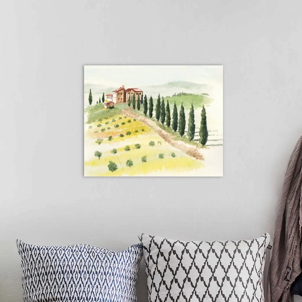 This watercolor artwork illustrates the beauty and simplicity of a Tuscan countryside with contrasting warm and cool colors in harmony.