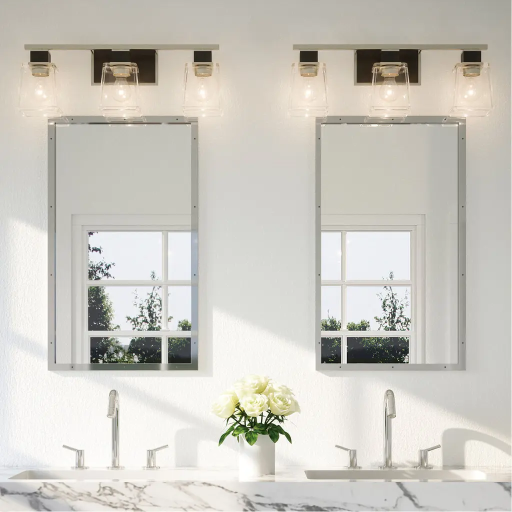 For a sleek and sophisticated bath update, choose the Tux vanity light. Its impeccable styling combines a Brushed Nickel finish with touches of black and clear, trapezoid glass shades that freshen and update an urban classic bath.