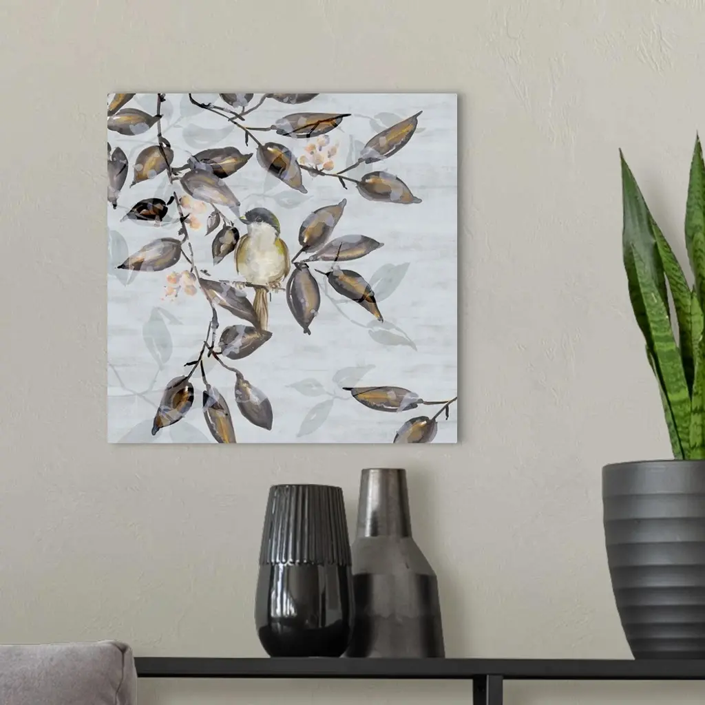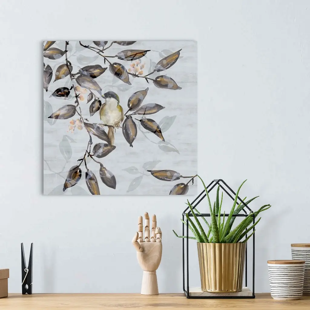 A contemporary painting of a bird on a tree branch against a neutral textured backdrop.