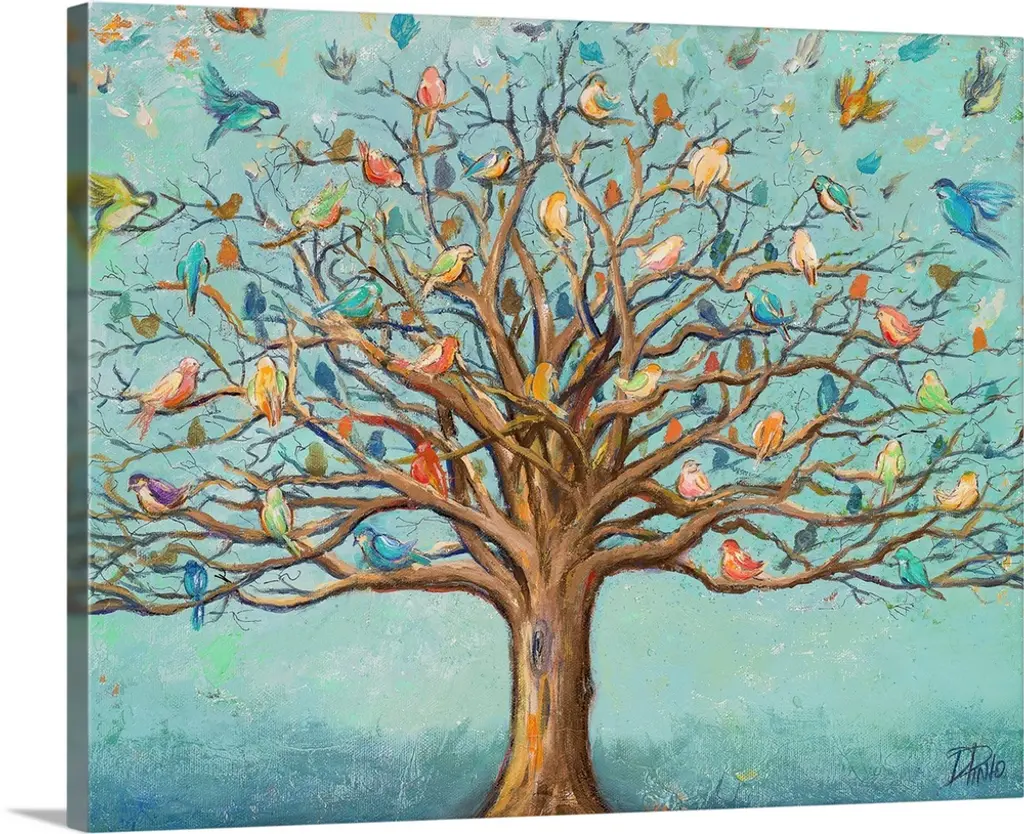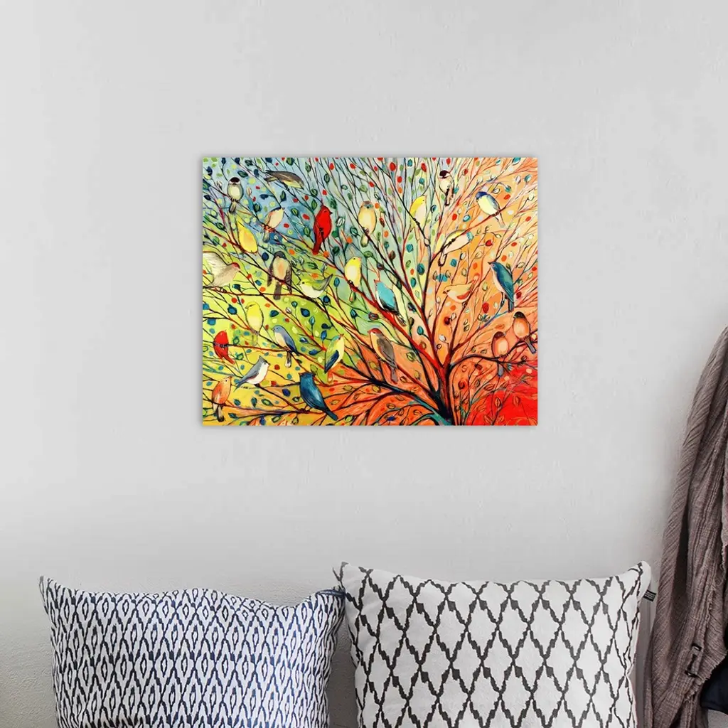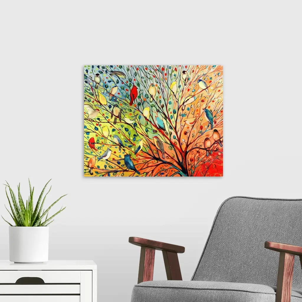 Landscape, oversized contemporary painting of a variety of birds in a tree with flowing branches and small leaves, on a background of multiple colors that transition from cool to warm.