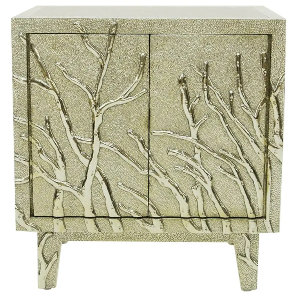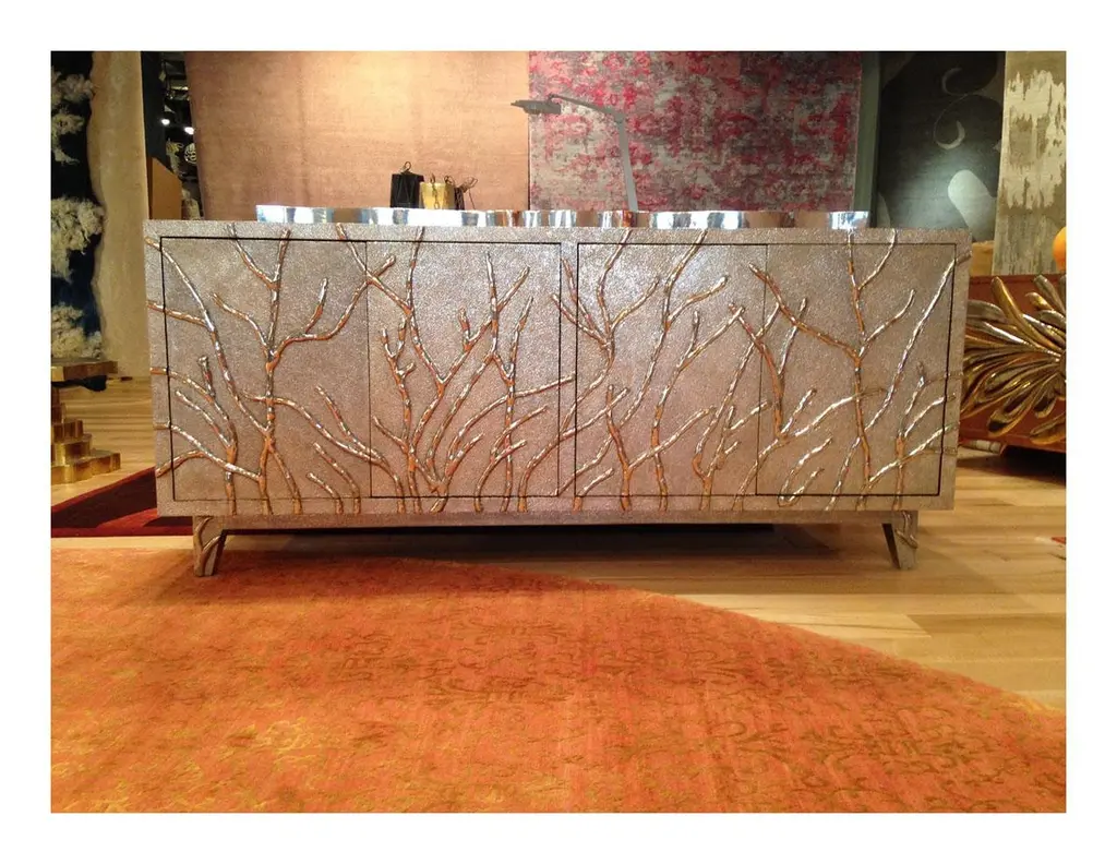 Inspired by the twig used in the paintings of palaces of Rajasthan. One of the best selling pieces of Stephanie Odegard collection. This elegant piece is hand made from solid teak which is joined to form the clean and elegant outline. The front is entirely sculpted out of a solid piece of wood by hand, then covered with metal sheeting. The available options for metal cladding are brass, white bronze, antiqued bronze, silver and copper. Both silver and copper will tarnish over time. Regular non-abrasive household metal polishes can be used to restore the original finish. Twig CredenzaSize- 24" x 18" x 28" H.Materials - Brass, Teak, Cast, Hand-CraftedPlease note that moisture in air, sudden change in temperature and natural movement of wood over time causes the metal to wrinkle or bubble up. We use well seasoned, reclaimed teak and high quality marine grade MDF (wherever technically possible) to avoid and delay the above mentioned changes. However a perfect stability of metal cannot be guaranteed.Buyer Cancellation-The cancellation charge is 25% which increases to 50% if the production is started.Prices do not include shipping from India (for custom orders) or our MN warehouse (items from stock). That will be additional.