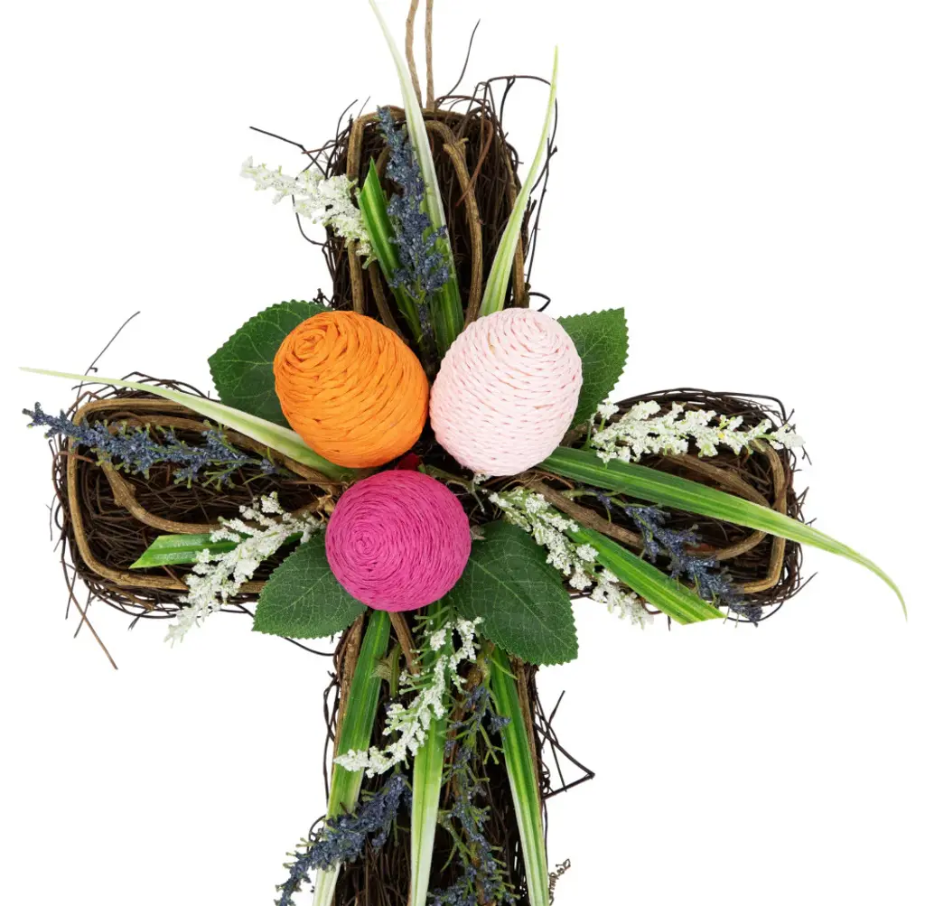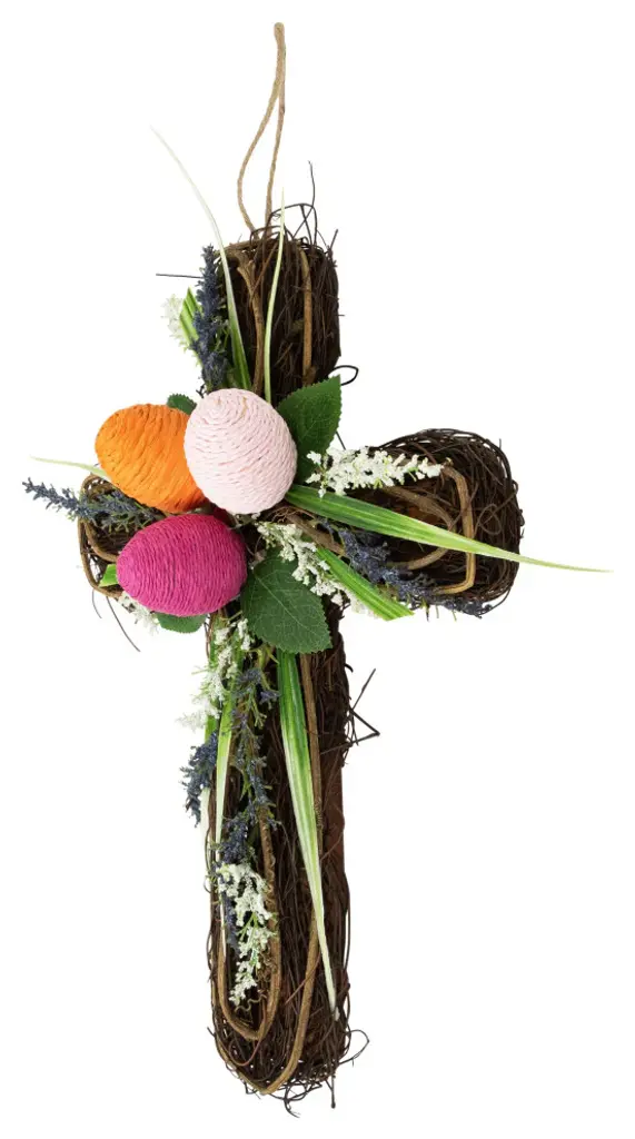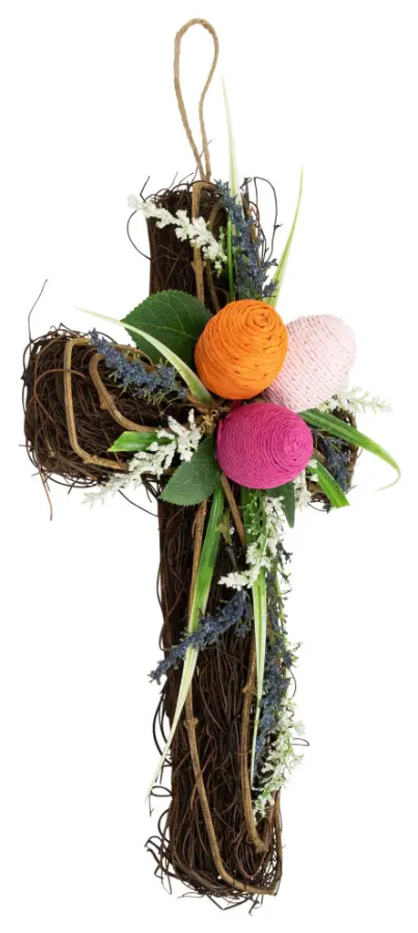 Add a touch of nature''s charm to your wall with our twig cross wall decoration. Adorned with vibrant green palms lush leaves and pops of purple and white flowers this charming piece brings nature''s beauty indoors. The center features three Easter eggs in delightful shades of pink orange and fuchsia adding a touch of whimsy to your decor. Elevate your walls with this delightful blend of nature and Easter cheer. Product Features: Twig Easter cross hanging decoration Decorated with green palms leaves and wild flowers Accented with colorful Easter eggs in the center Comes with a foam backing Ready to hang with attached jute rope For indoor use only Dimensions: 13.25"H x 8.5"W x 3"D Material(s): twig/fabric/foam