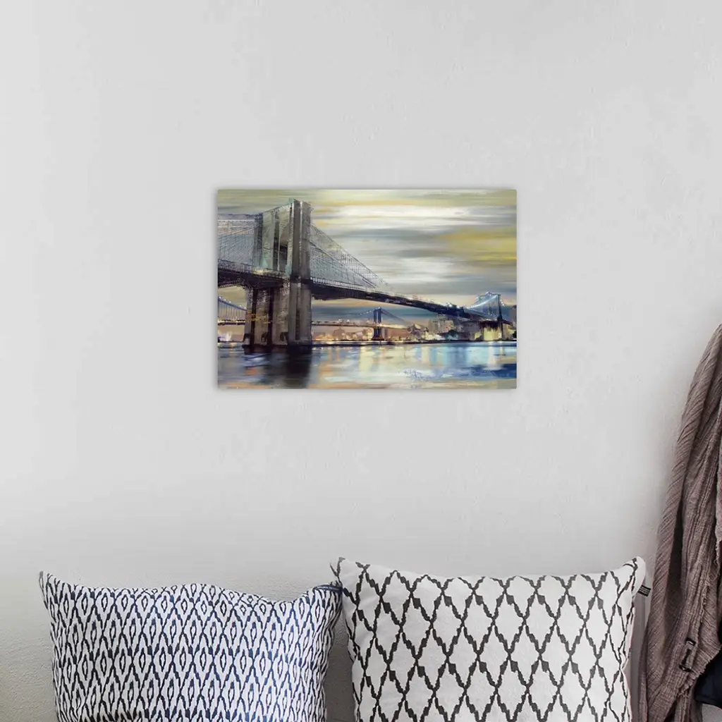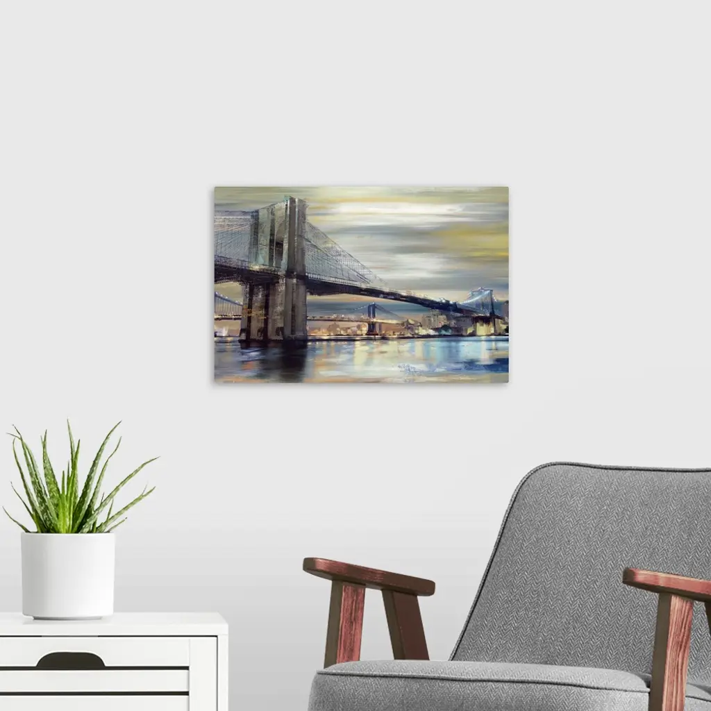 Contemporary home decor artwork of the Brooklyn bridge over the river at twilight.