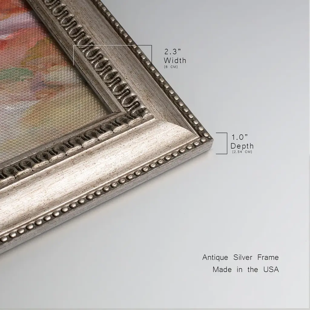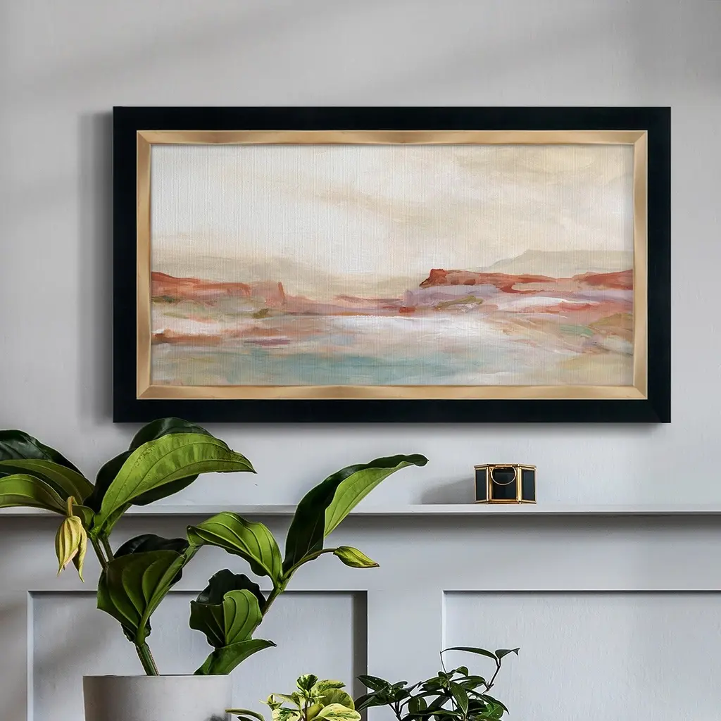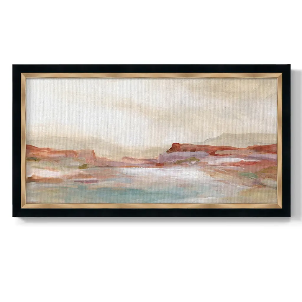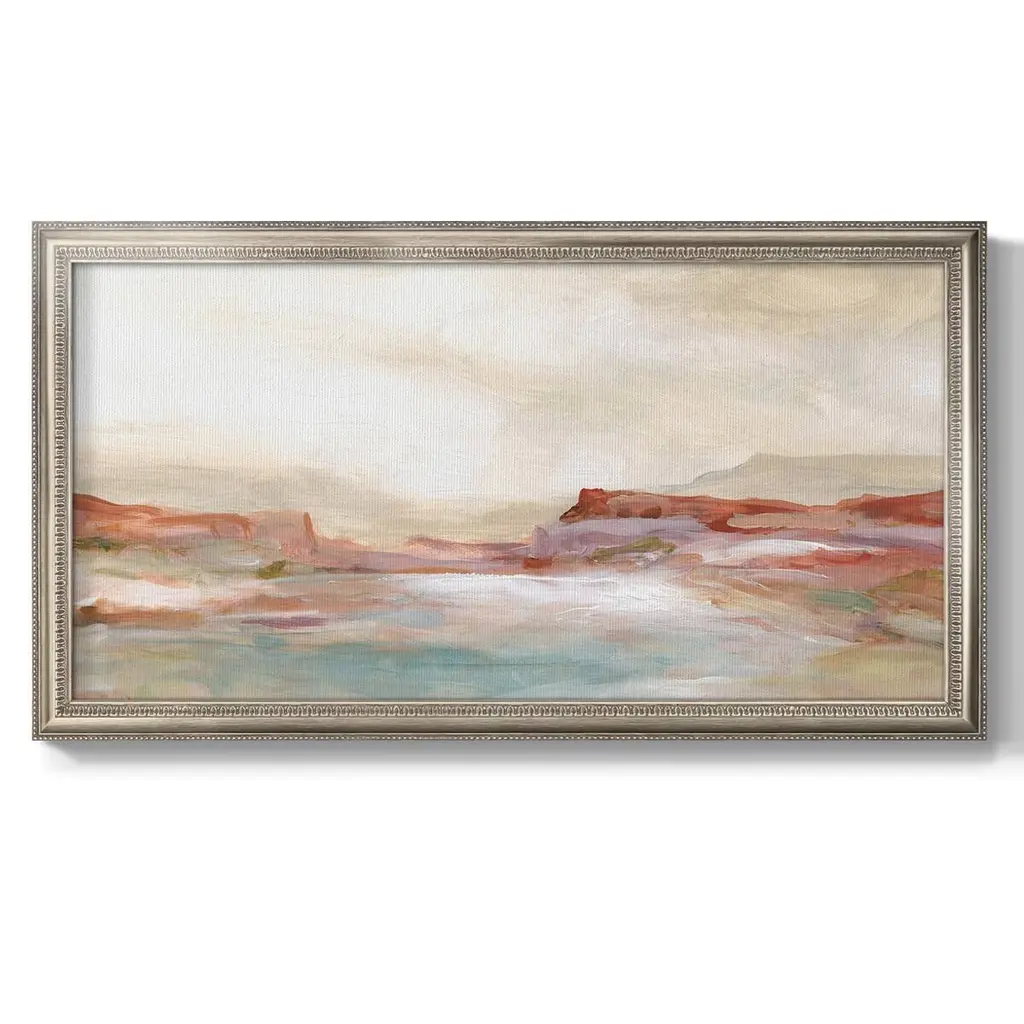 Twilight Desert Mirage Premium Framed Canvas- Ready to Hang A Premium Framed Canvas created to last. Framed in distressed wood and available in an array of sizes and colors Featuring a beveled a solid wood stretcher bar, each piece comes ready to hand 3 SIZES AVAILABLE 21''X37'' - Overall Size 25''X45'' - Overall Size 29''x53'' - Overall Size Each piece is made to order. Each piece comes with hanging hardware. Made in the USA Ready to Hang Giclee Paper Print Acrylic Glass Beveled Matt Board