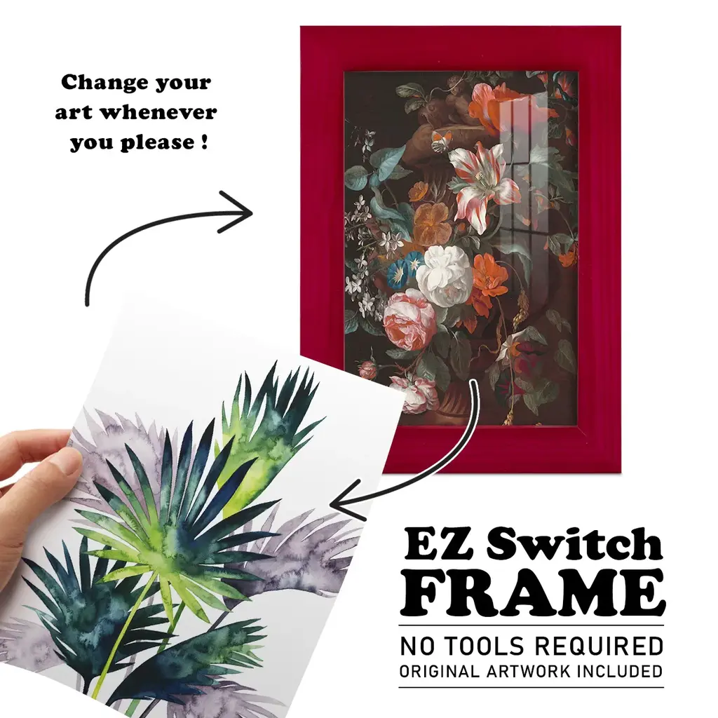 Twilight Palms III -EZ SWITCH Framed Print w/glass-Cherry Red A delightful, framed print. Featuring a solid wood frame with real wood glass. This premium print is giclee quality. In addition, every frame features a removable back and table top stand. This allows you to change your art in the future or to just stand the art on a table for a new look. We are sure you'll enjoy our new series of EZ SWITCH Framed Art. Solid Wood Frame Real Glass Removable / Replaceable Art Built in Tabletop Stand Sizes range from 4x6 up to 12x15 - buy just one or pair them up as sets as you see fit.