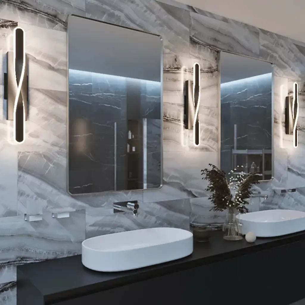 Minimalist lighting design with twisted interest. The Twist LED Vanity Light by AFX Lighting features a long steel frame, with a single 180-degree turn in the center. This detail gives the overall design of this vanity light an elegant touch of distinction, as well as maximizing the breadth of useful light around a vanity area. Acrylic provides a smooth finishing touch and ensures an even, glare-free wash of energy efficient LED light over a vanity mirror and all around a modern bathroom.