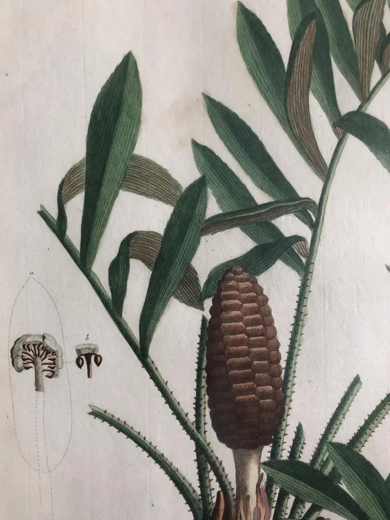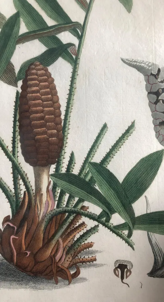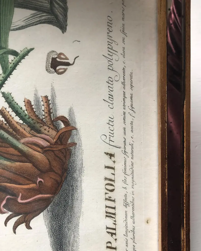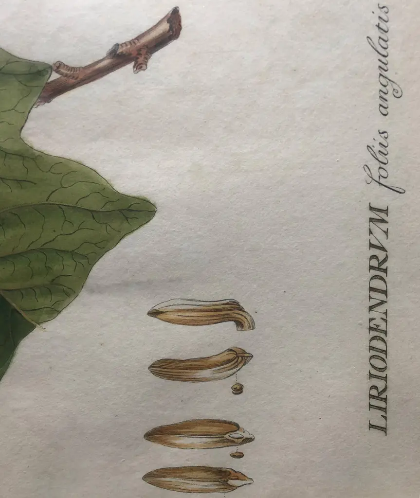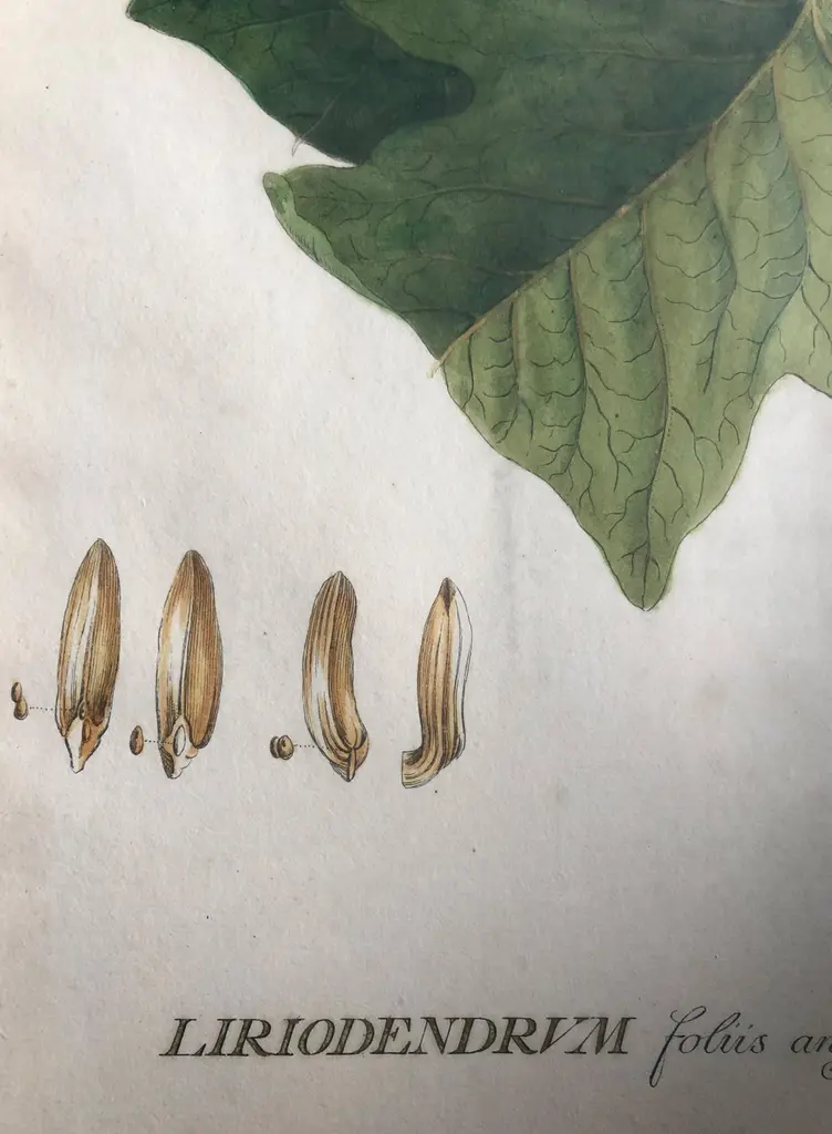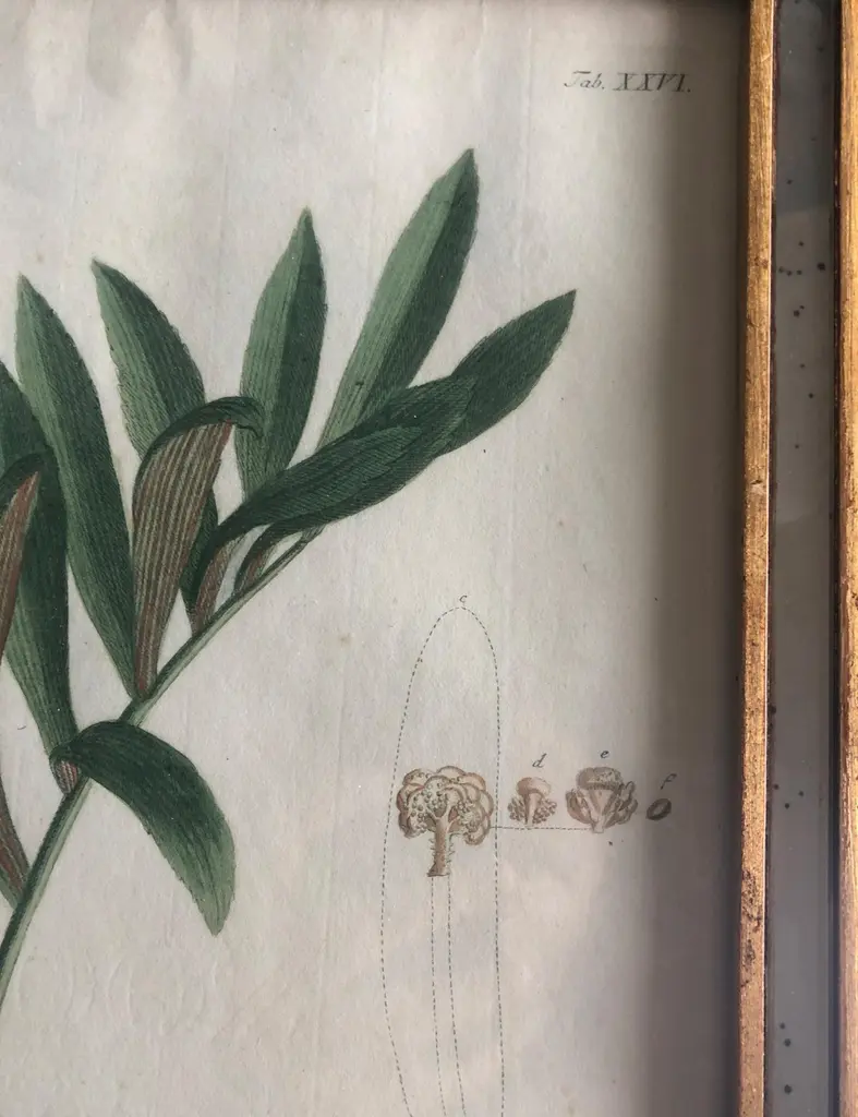 Adorning the walls, two gracefully framed botanical engravings from 1771 capture nature's elegance in exquisite detail. Delicate strokes of artistry breathe life into intricate foliage, showcasing the intricate beauty of palm leaves and lush fronds. Mirrored glass frames lend an air of sophistication, casting a gentle radiance that illuminates both art and observer. These framed engravings invite us to ponder the timeless allure of nature's diversity and grace. The copperplate engraving "Palmifolia," crafted in 1771 by an anonymous engraver, offers a captivating portrayal of botanical splendor. This intricately detailed artwork captures the elegant fronds and intricate structure of a palm tree with remarkable precision. Through their masterful technique, they provide us a glimpse into the botanical wonders of the past, sparking a sense of wonder and appreciation for the intricate beauty of nature's creations.The copperplate engraving 'Liriodendrvm' was created in 1771 by an unknown engraver. It depicts a detailed representation of the foliage and structure of a Liriodendron tree. The distinctive leaves are clearly depicted with their unique angled and lobed shape. The engraving captures subtle details of the veins and contours of the leaves, providing the viewer with insight into the botanical beauty and diversity of this tree. This artwork captures the spirit of early botanical exploration and showcases how such works played a significant role in documenting and understanding the plant world at that time.
