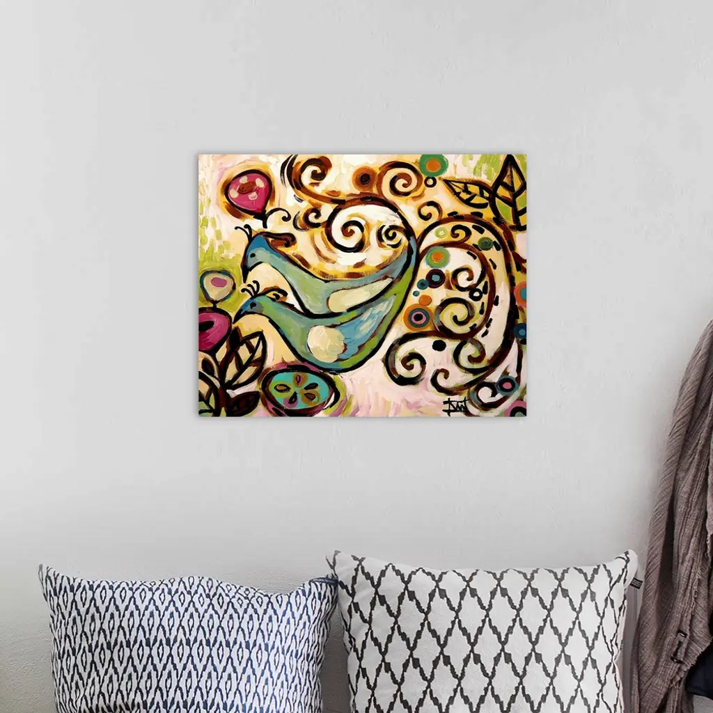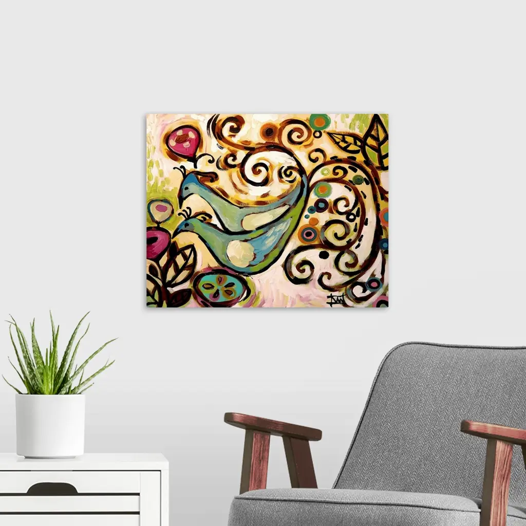 Contemporary painting of two birds with long, curled tail feathers.
