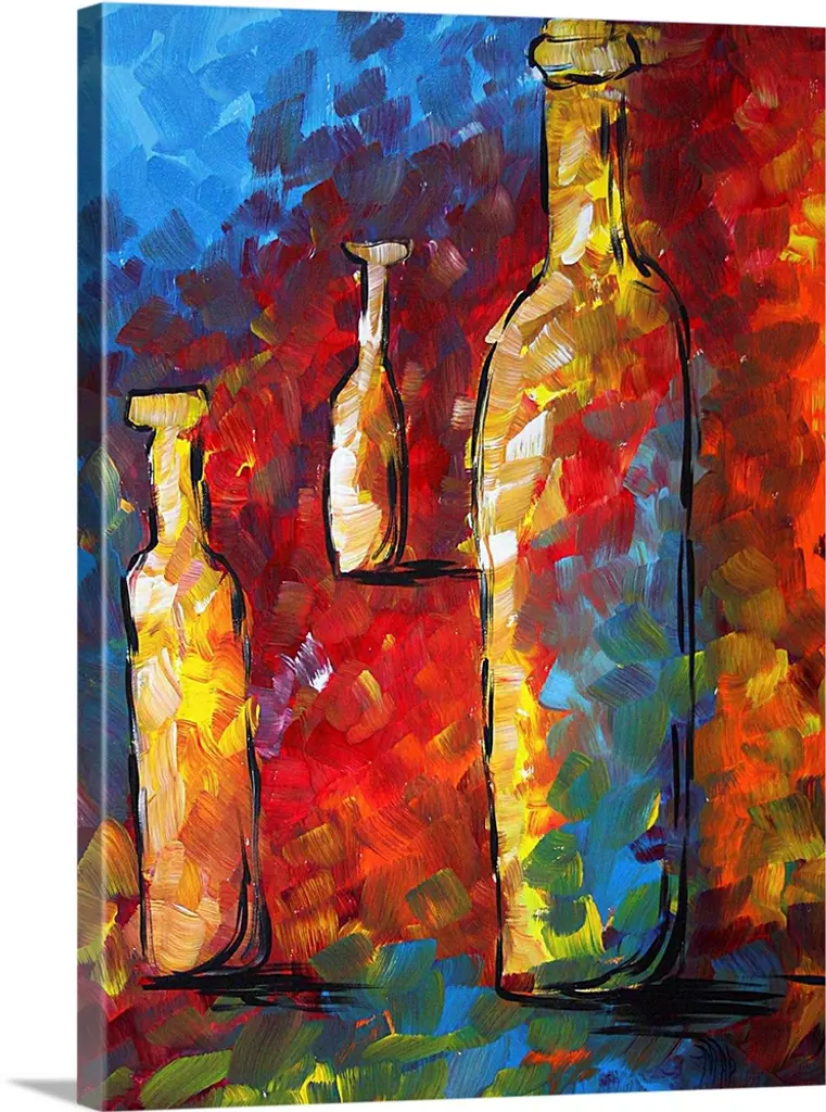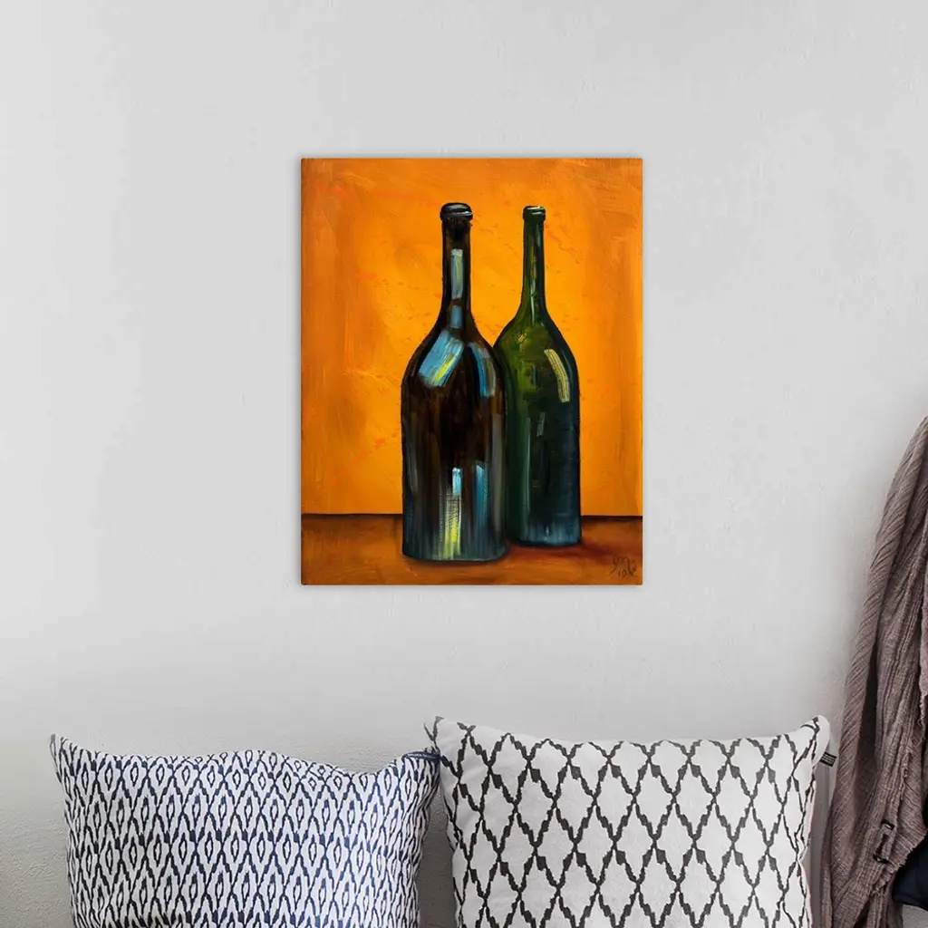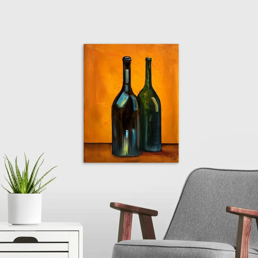 Contemporary painting of two wine bottles on an orange background with a little bit of orange paint splatter.