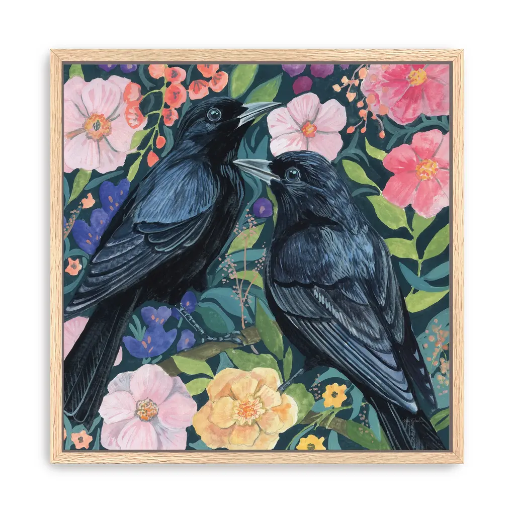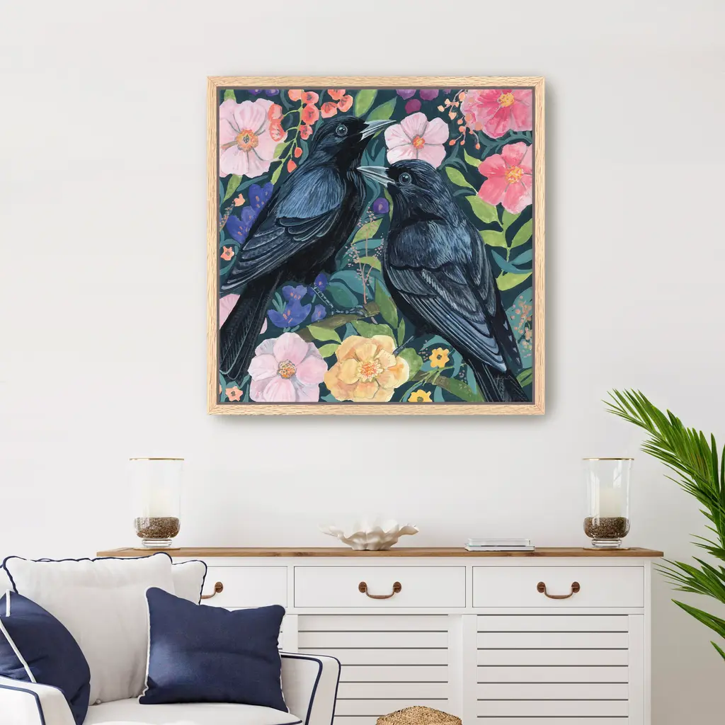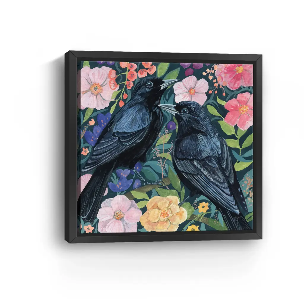 Two Crows On Flowers Canvas Giclee - Framed / Black / 20x20