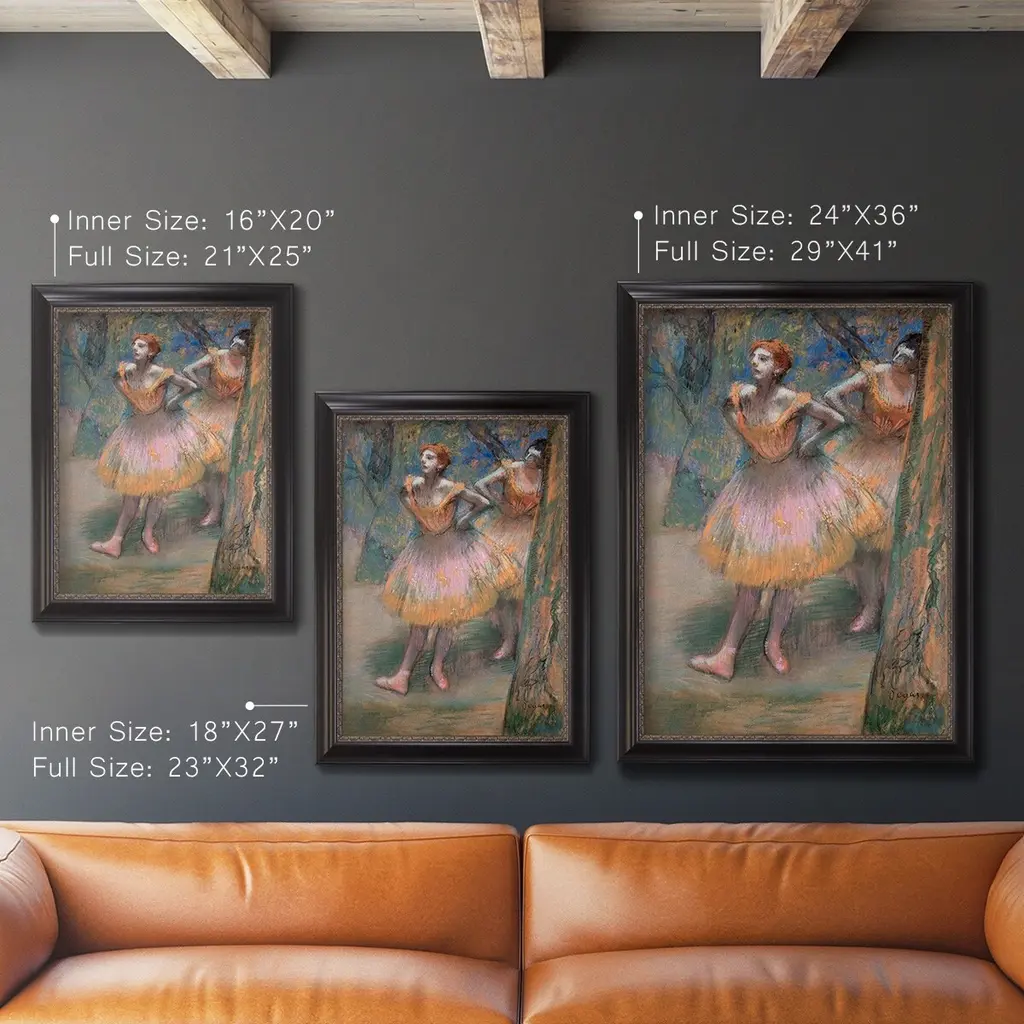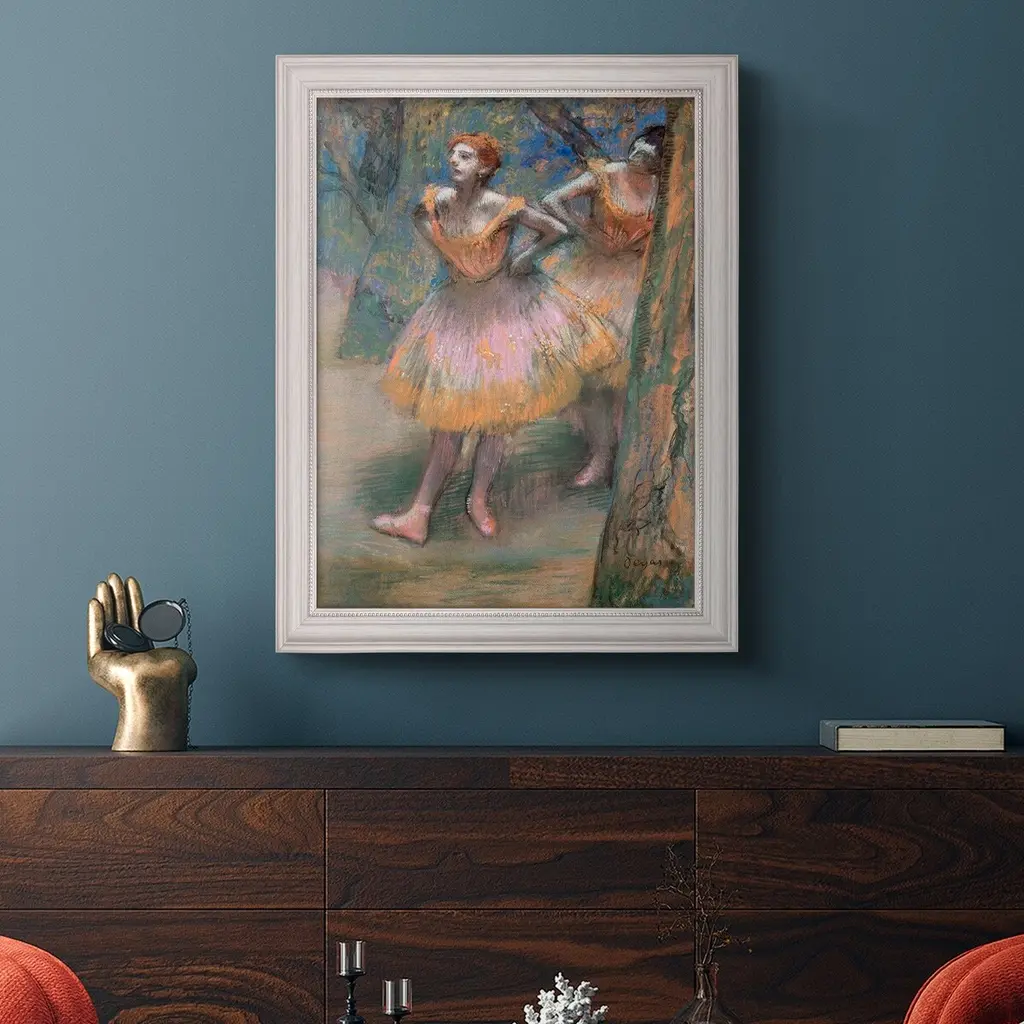 Two Dancers Premium Framed Canvas- Ready to Hang A Premium Framed Canvas created to last. Framed in distressed wood and available in an array of sizes and colors Featuring a beveled a solid wood stretcher bar, each piece comes ready to hand 3 SIZES AVAILABLE 16''X20'' - Overall Size 18'X27'' - Overall Size 24''x36'' - Overall Size Each piece is made to order. Each piece comes with hanging hardware. Made in the USA Ready to Hang Giclee Paper Print Acrylic Glass Beveled Matt Board